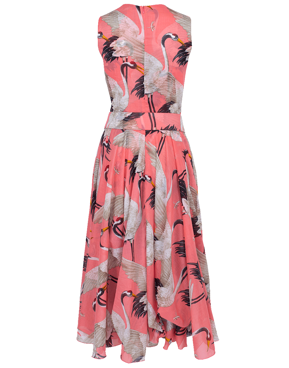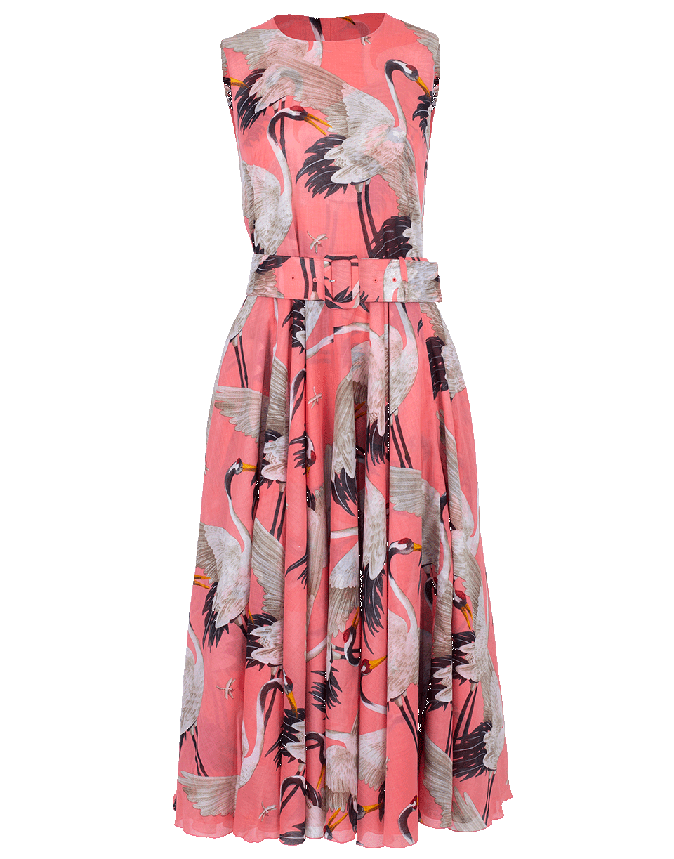 The Aster midi dress from Samantha Sung features a sleeveless cut, round neckline, belted waist, crane print, full circle skirt, concealed back zip closure, and a midi lengh. Matching sash included.