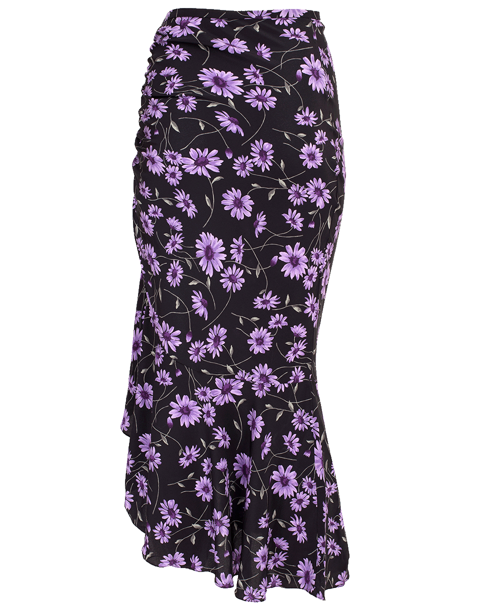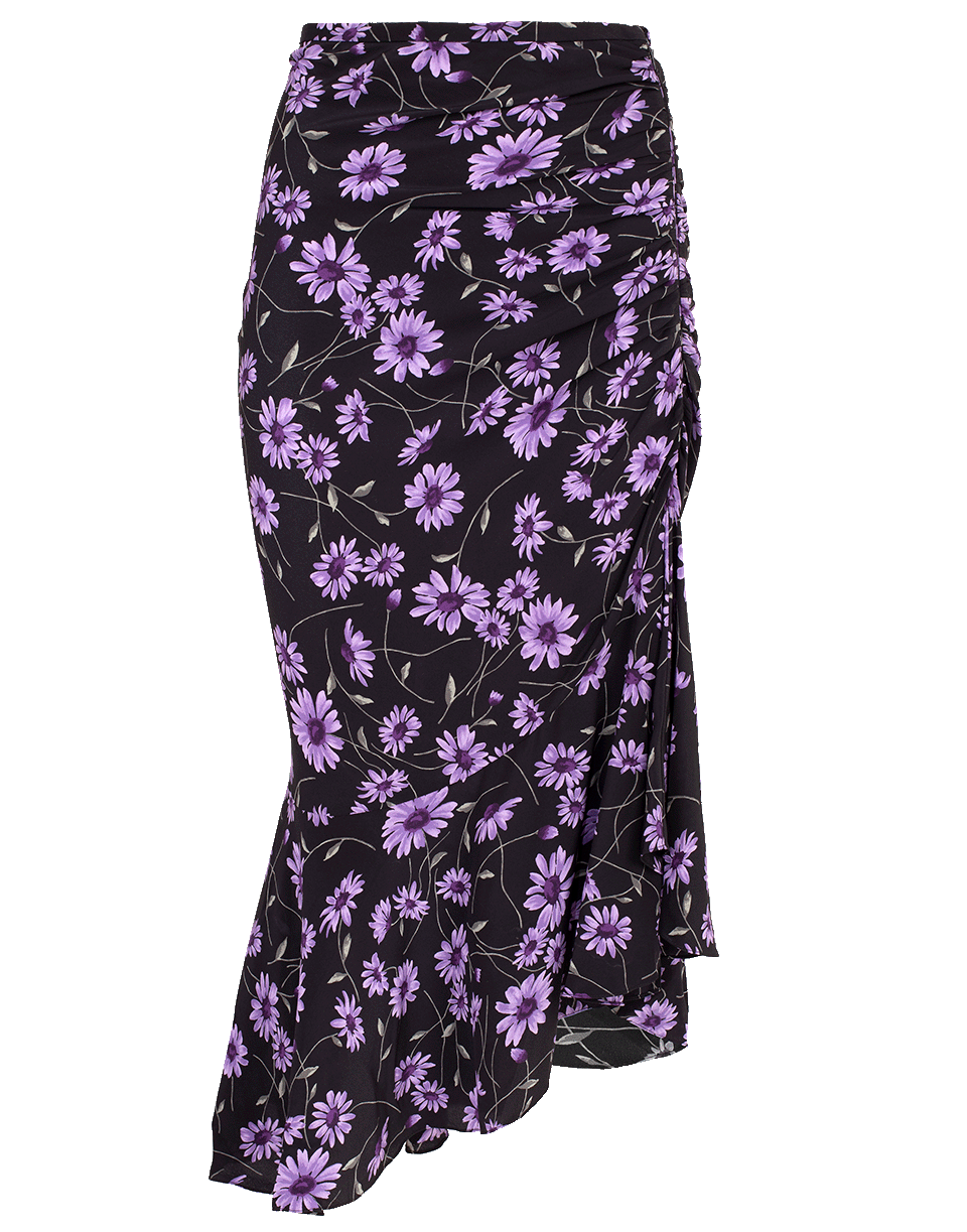 Daisy crepe de chine knee length skirt from Michael Kors featuring a mid-length, slim fit with a gathered side, and aymmetric pleated hem.