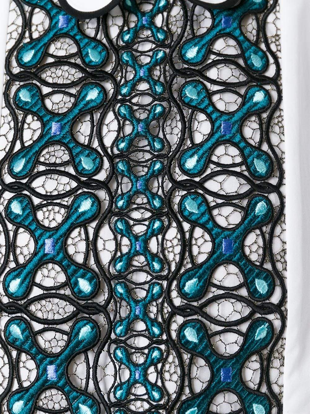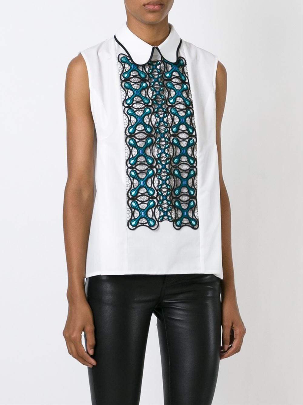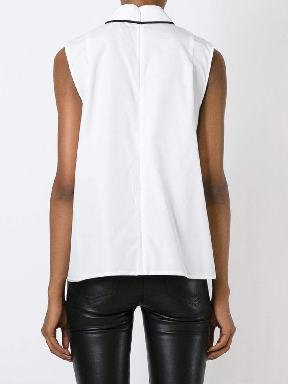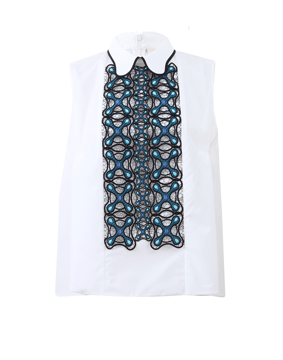 Spread Collar With Piping Detail, Front Placket Embellishment, And Foldover Front Pleating