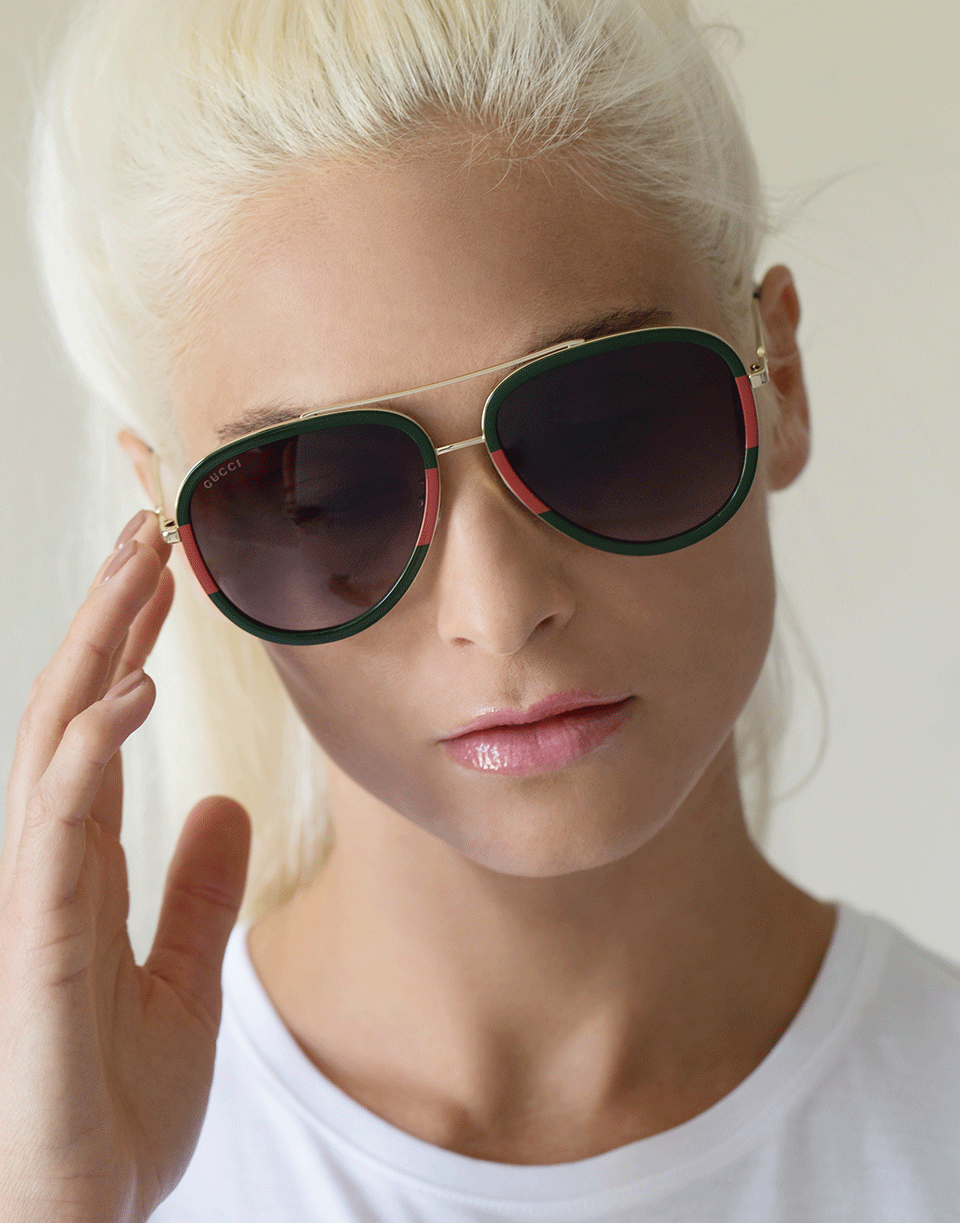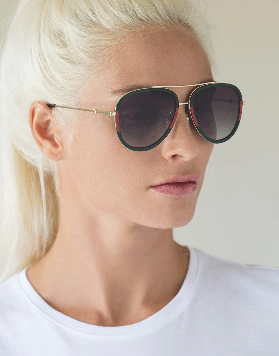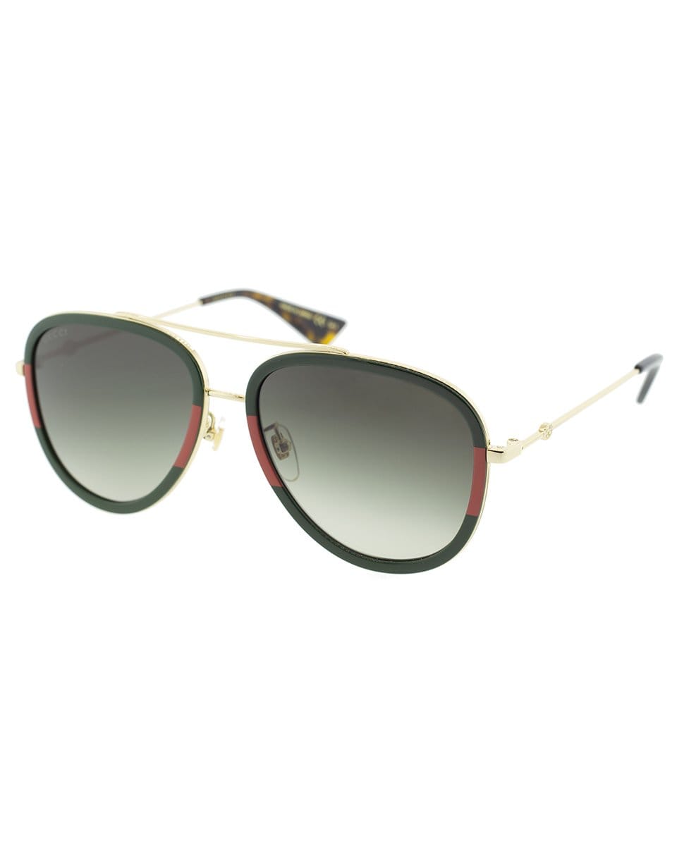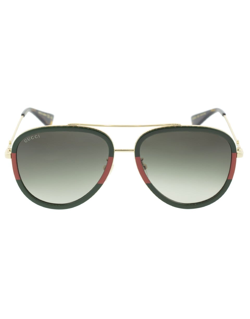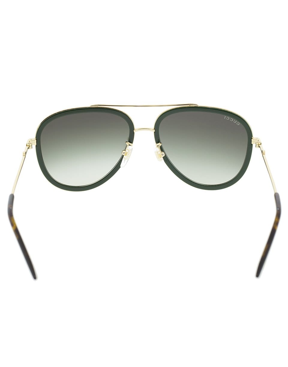 Gucci aviator metal sunglasses featuring a green and red frame, gold metal temples with black tips, and green shaded lenses.