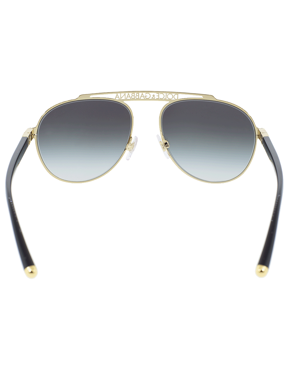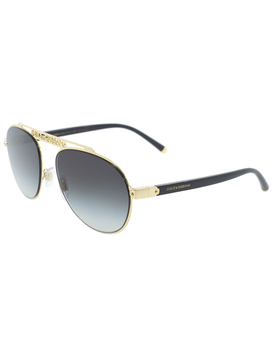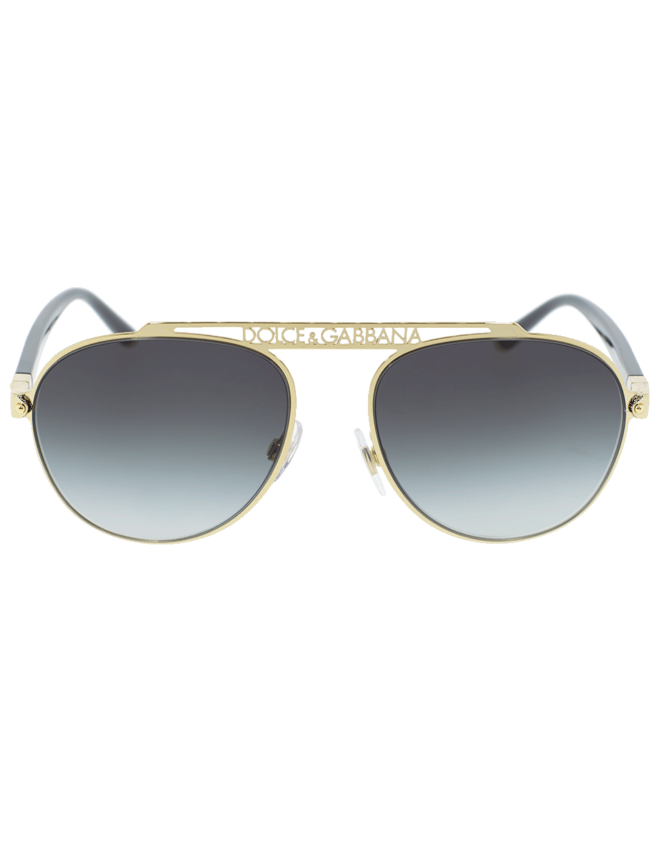 These Dolce & Gabbana sunglasses feature a classic aviator silhouette with goldtone hardware, print logo on the brow bar, and grey lenses.