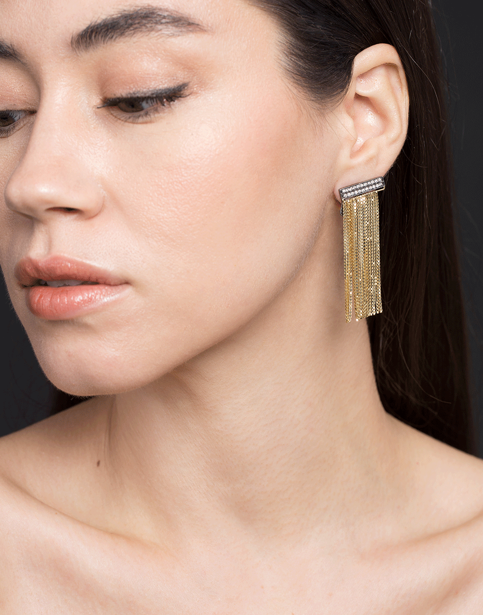 Axl fringe diamond bar earrings by Sorellina. Pierced ears.