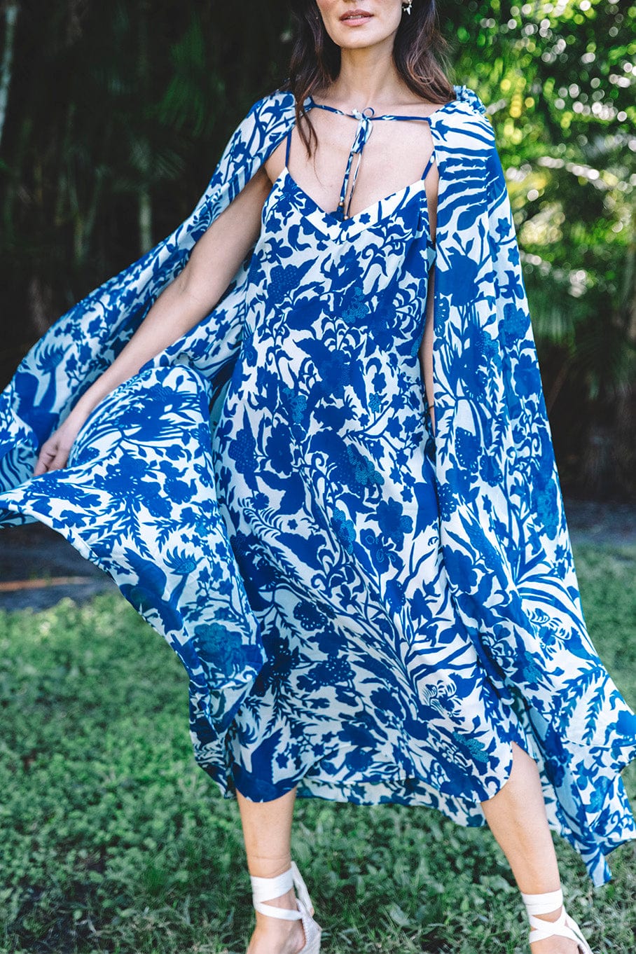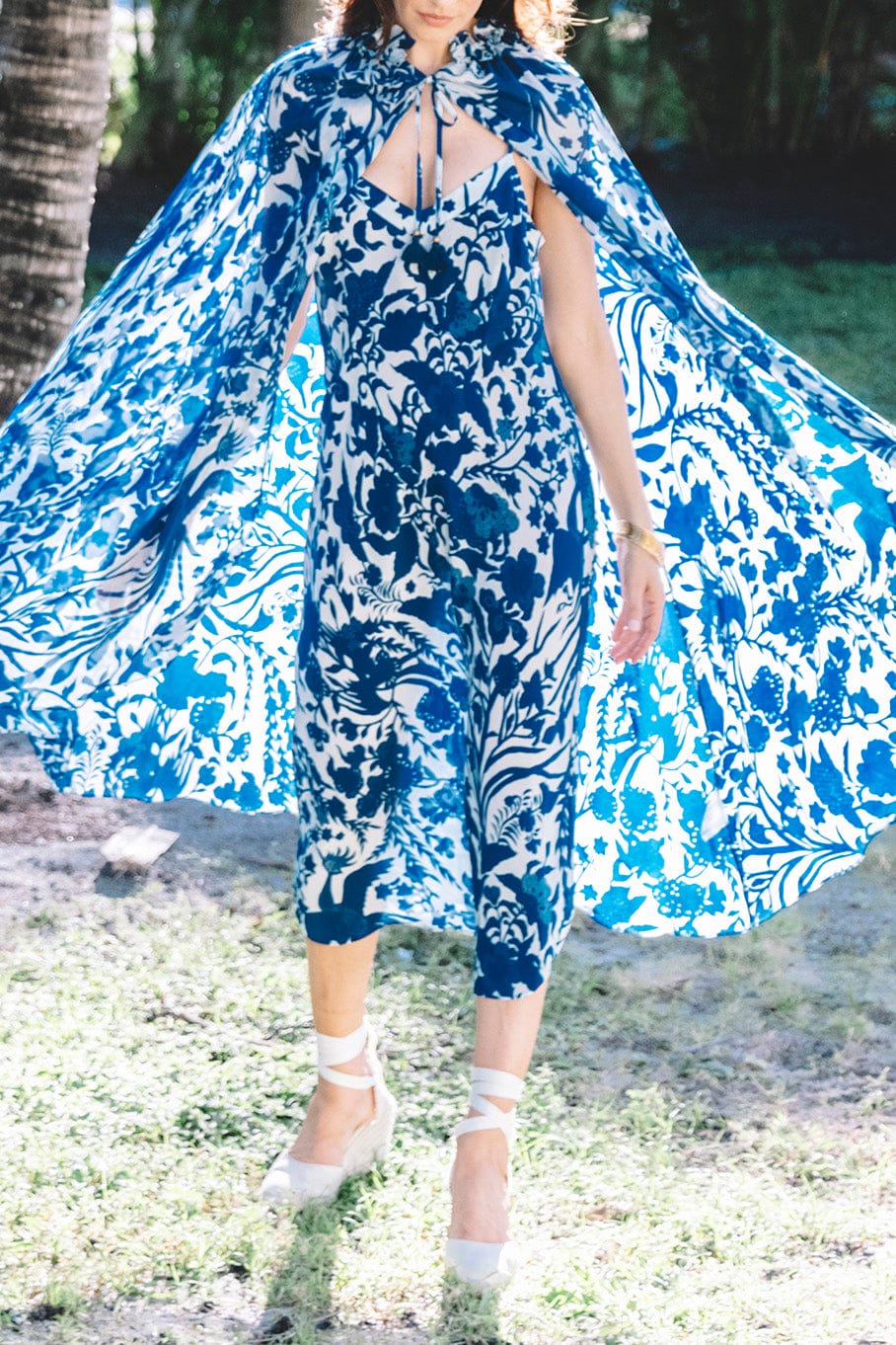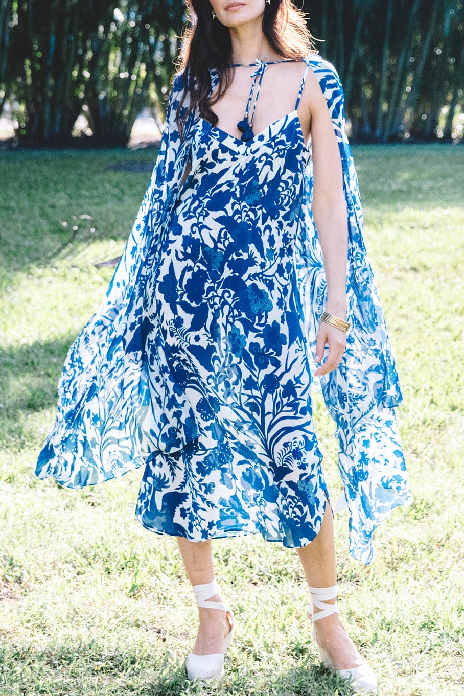 Figue ayla cape in white navy. This airy silk chiffon cascading-back cape is framed by a ruffled neckline and coordinating tassel ties to secure its open front. Style it over the shoulders of the matching Carolyne Slip for an instantly, ethereally glamorous evening look.
