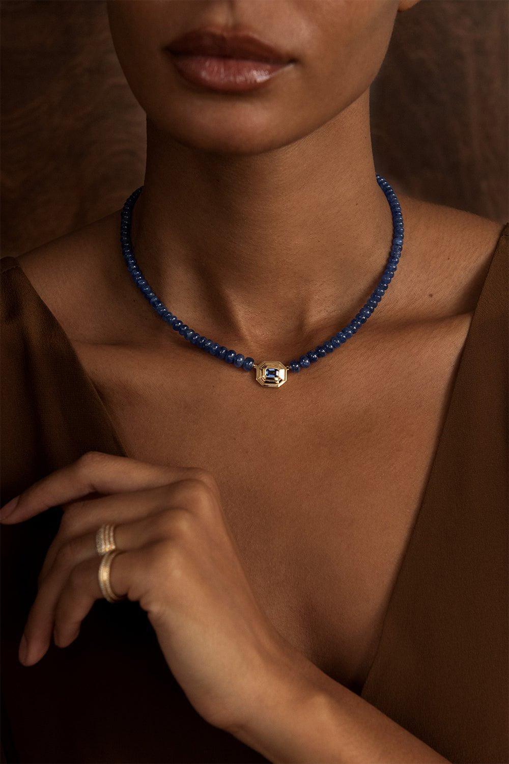 Azlee rich sapphire bead staircase necklace in yellow gold.