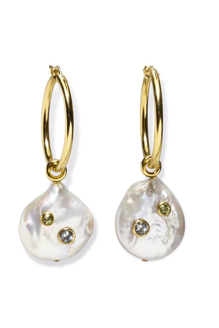 Lizzie Fortunato azure pearl hoops. Our love of pearls knows no bounds! Revel in the organic beauty of these freshwater pearl drops inlaid with precious emerald and sky blue topaz stones. Sitting pretty on gold vermeil hoop earrings for everyday wear.