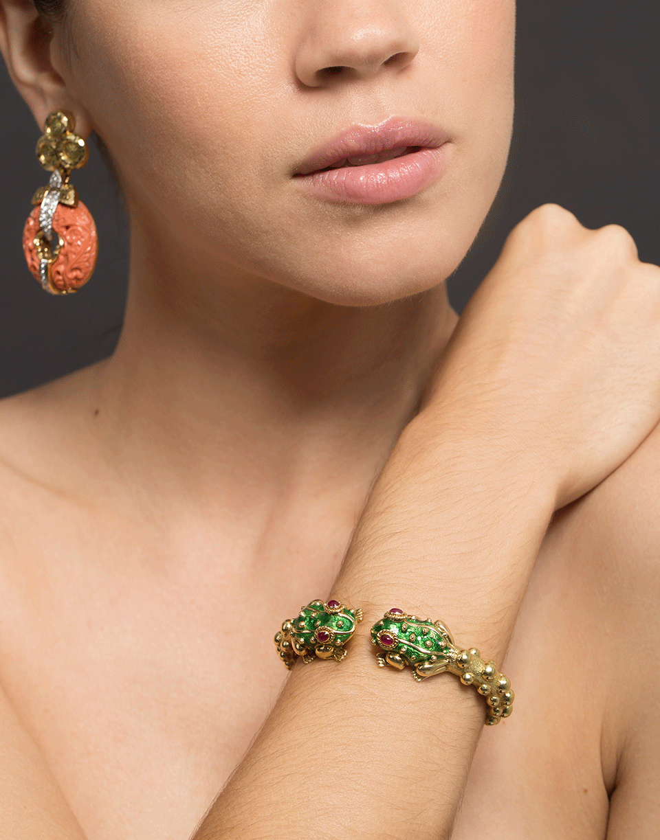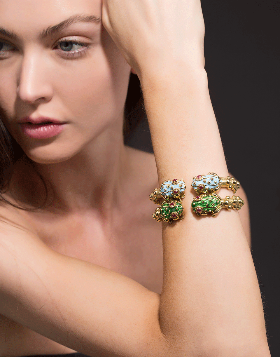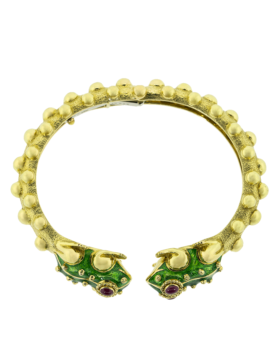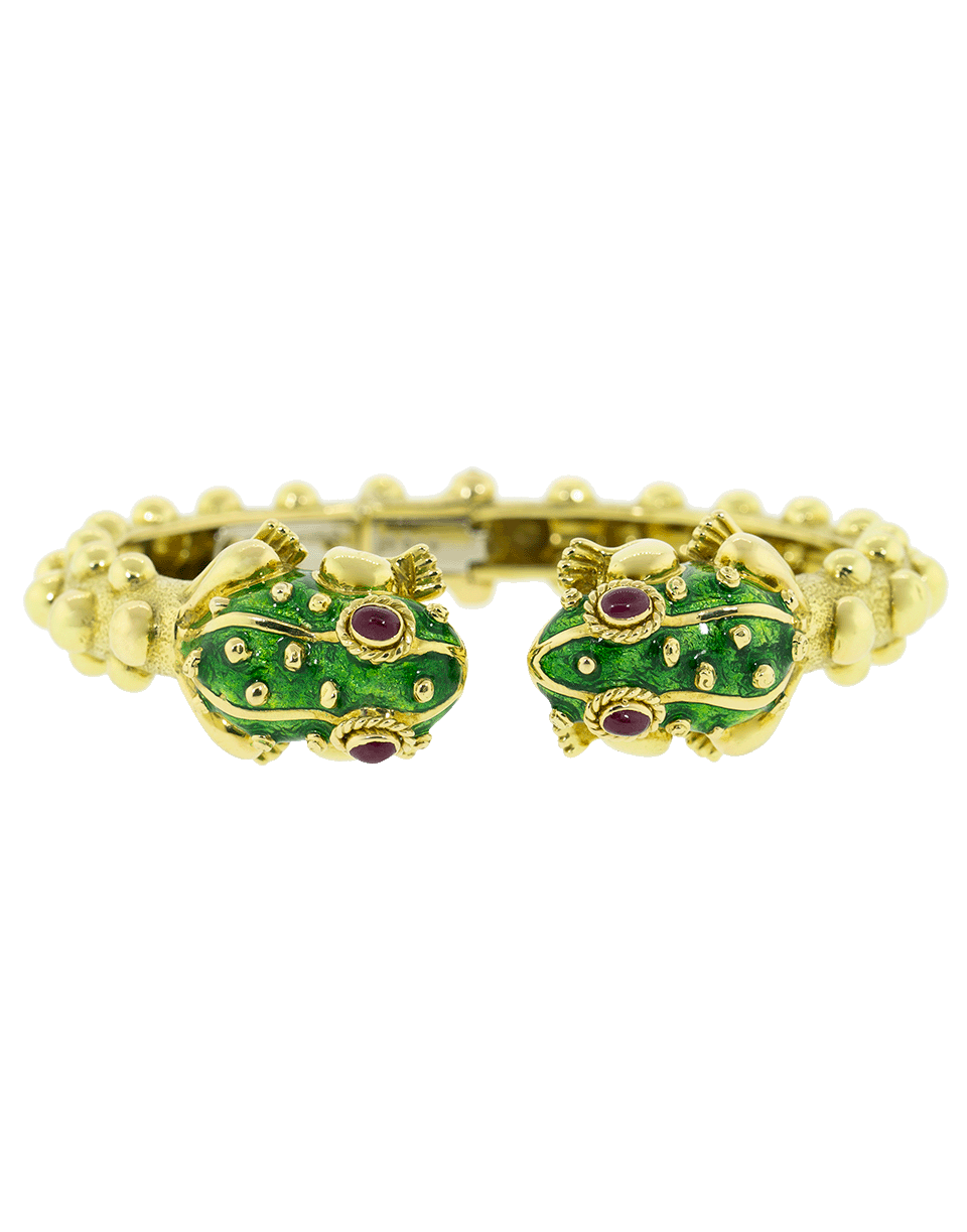David Webb’s baby frog kick cuff from the Kingdom Collection features 18k yellow gold, beaded details and frog-shaped ends with green enamel and cabochon ruby eyes.