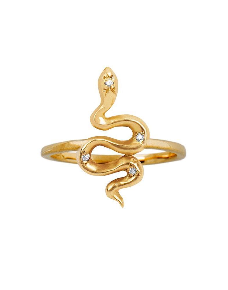 Logan Hollowell baby kundalini diamond snake ring. 14k gold and mini diamond snake ring with four star-set diamonds, .05ct total weight.