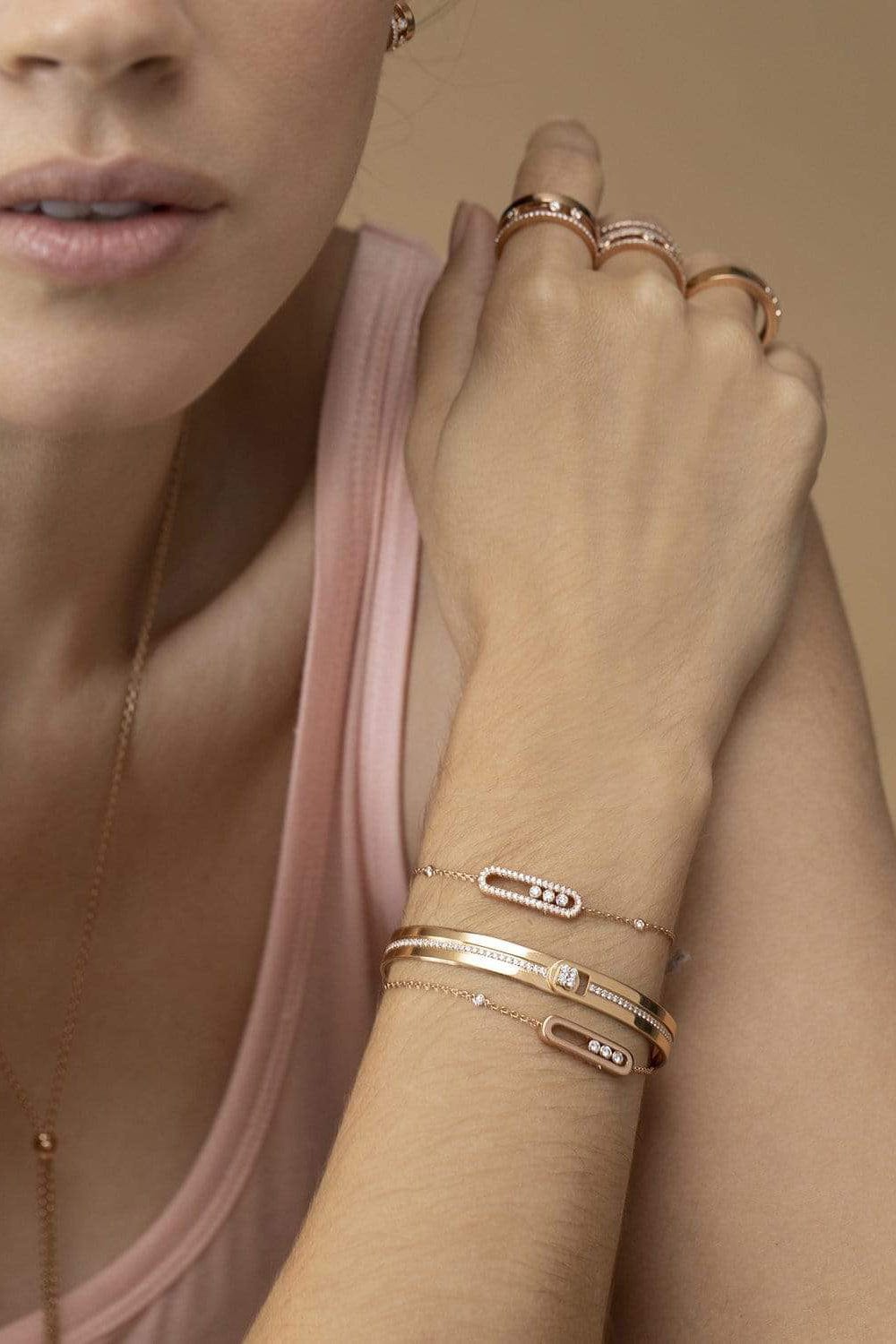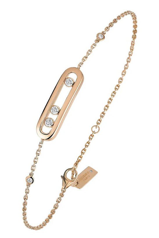 Messika Baby move diamond bracelet. Let be seduced by the 18 carat gold pavé diamond bracelet Baby Move. Fully handcrafted, this luxury bracelet for women is part of the Move collection, the signature of Messika House. With its three moving diamonds that shine according to one's movements, this Baby Move pink gold diamond bracelet suits the thin wrists. This pavé diamond bracelet is the ideal everyday companion of a woman with its pared down graphic style and essential lines, the talisman symbol of the love of yesterday, today and tomorrow. You'll love this chic detail on this gold pavé diamond bracelet: the adorning diamonds on the chain. The shimmering gold, created by Messika luxury jewelry House, enlightens the wrist with a soft glow.