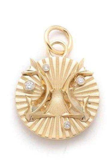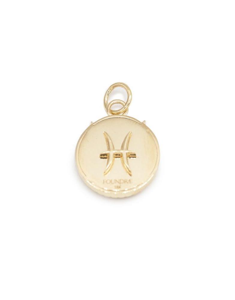Foundrae baby pisces medallion. The 18kt yellow gold Baby Medallion charm represents the Astrology Sign, Pisces. Intuitive, artistic, generous, faithful, compassionate, caring, imaginative, sensitive, otherworldly, sympathetic. The Ruling Planet is Neptune which longs for transcendence via spirituality and imagination. Birthdays: February 19-March 20, Water Element.