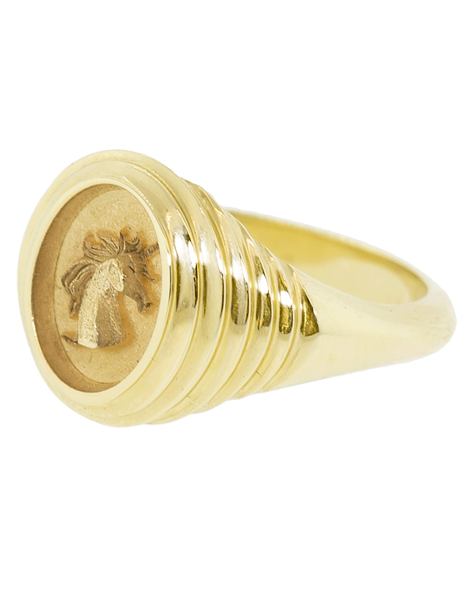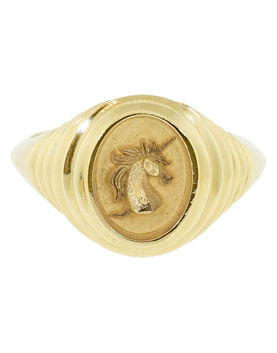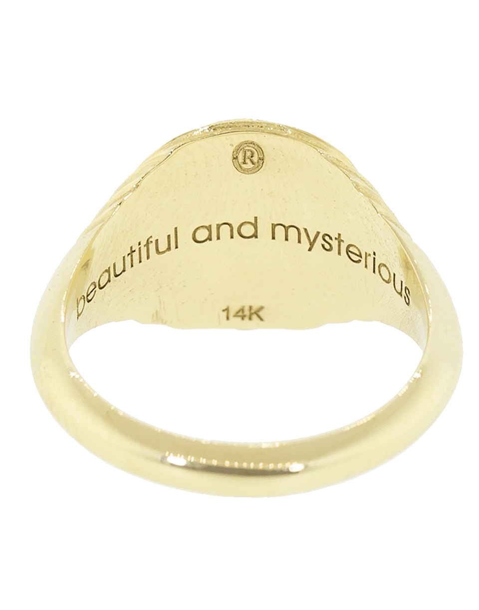 Baby fantasy unicorn signet ring with "beautiful and mysterious" engraved inside.