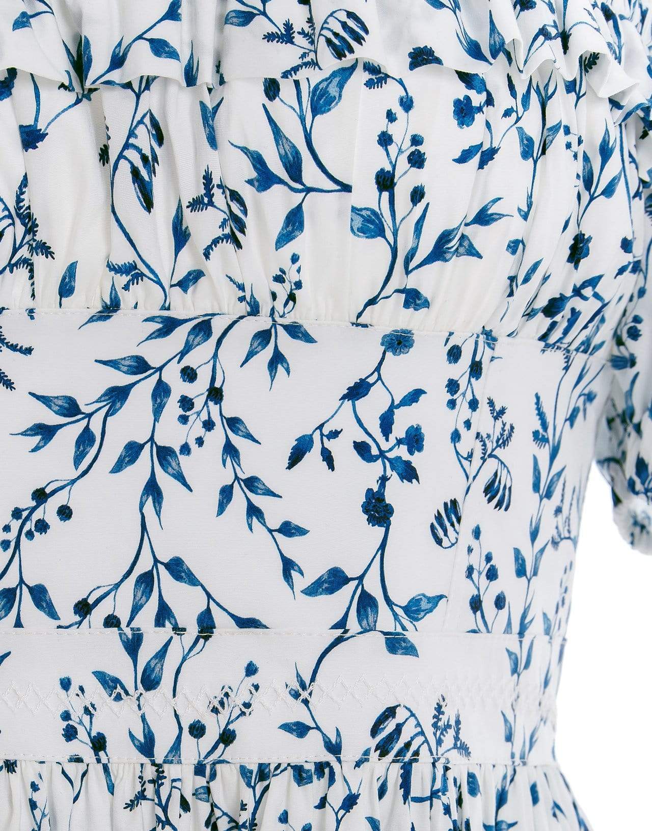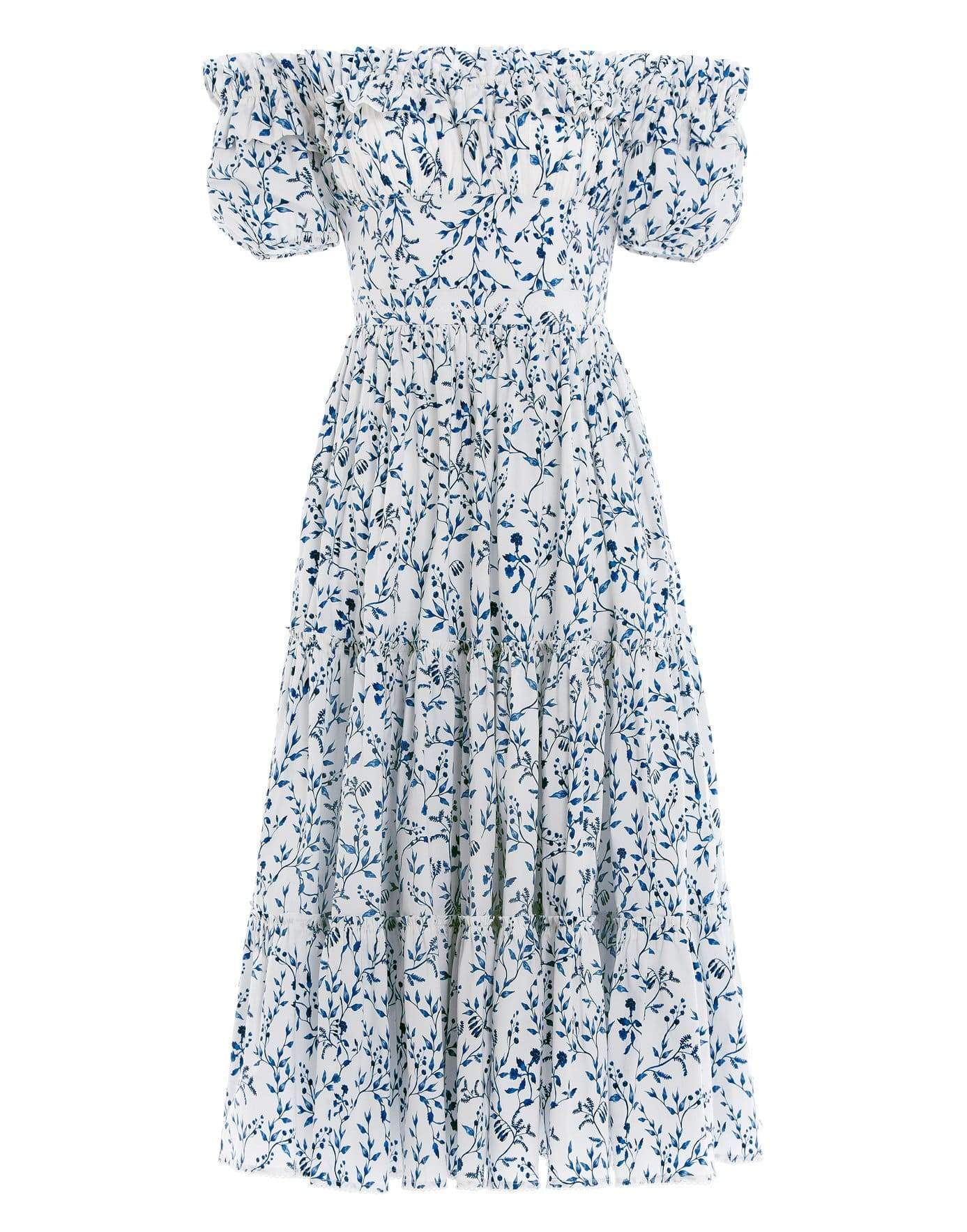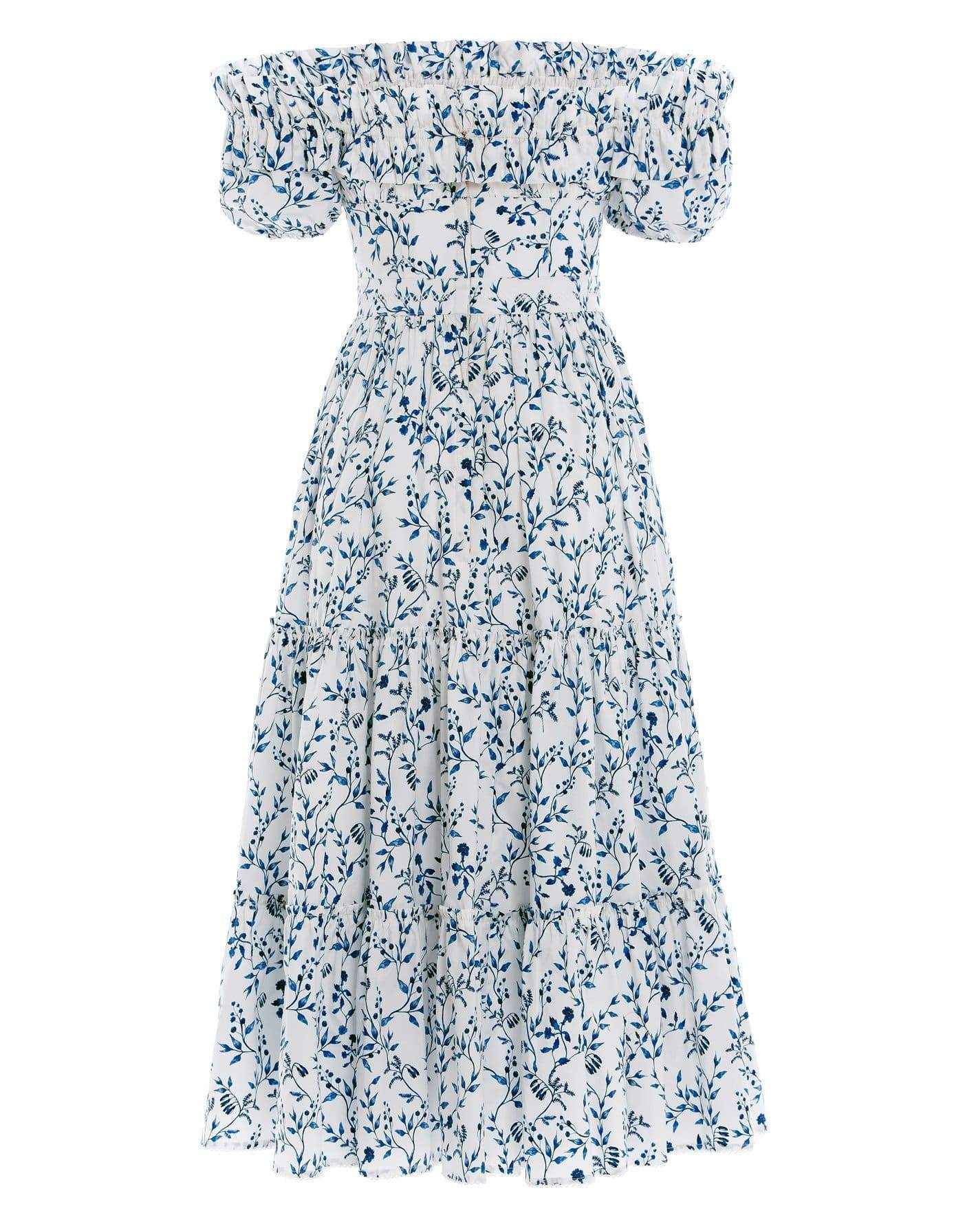 Agua by Agua Bendita banana acacias-printed cotton poplin off-the-shoulder midi dress. Slim fit, smocked off-the-shoulder neckline, short puff sleeves with elastic cuffs, fitted waist, tiered A-line skirt, lined.