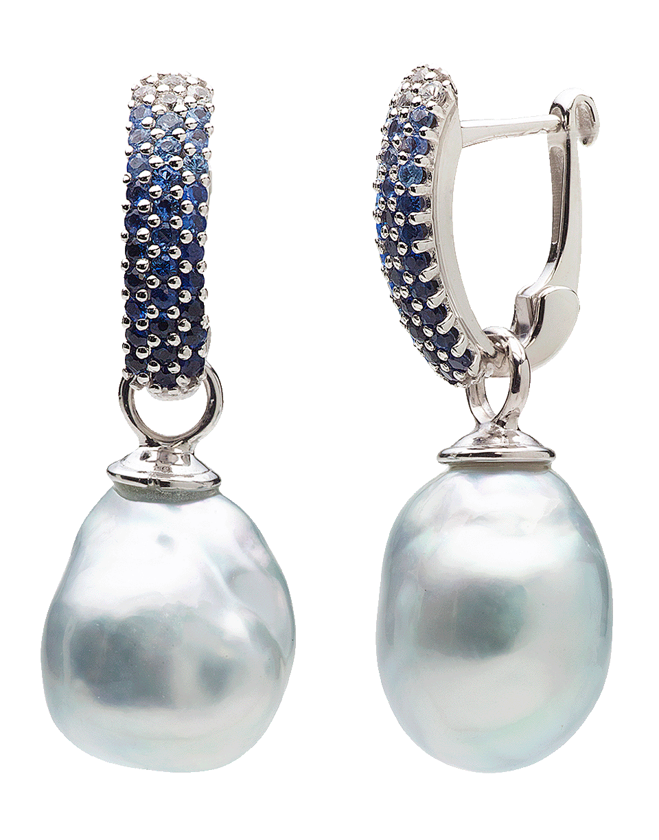 Best known for their innovative use of pearls, Baggins have outdone themselves again with this dainty pair featuring sapphires set in 18k white gold and finished with a rare South Sea Baroque cultured pearl.