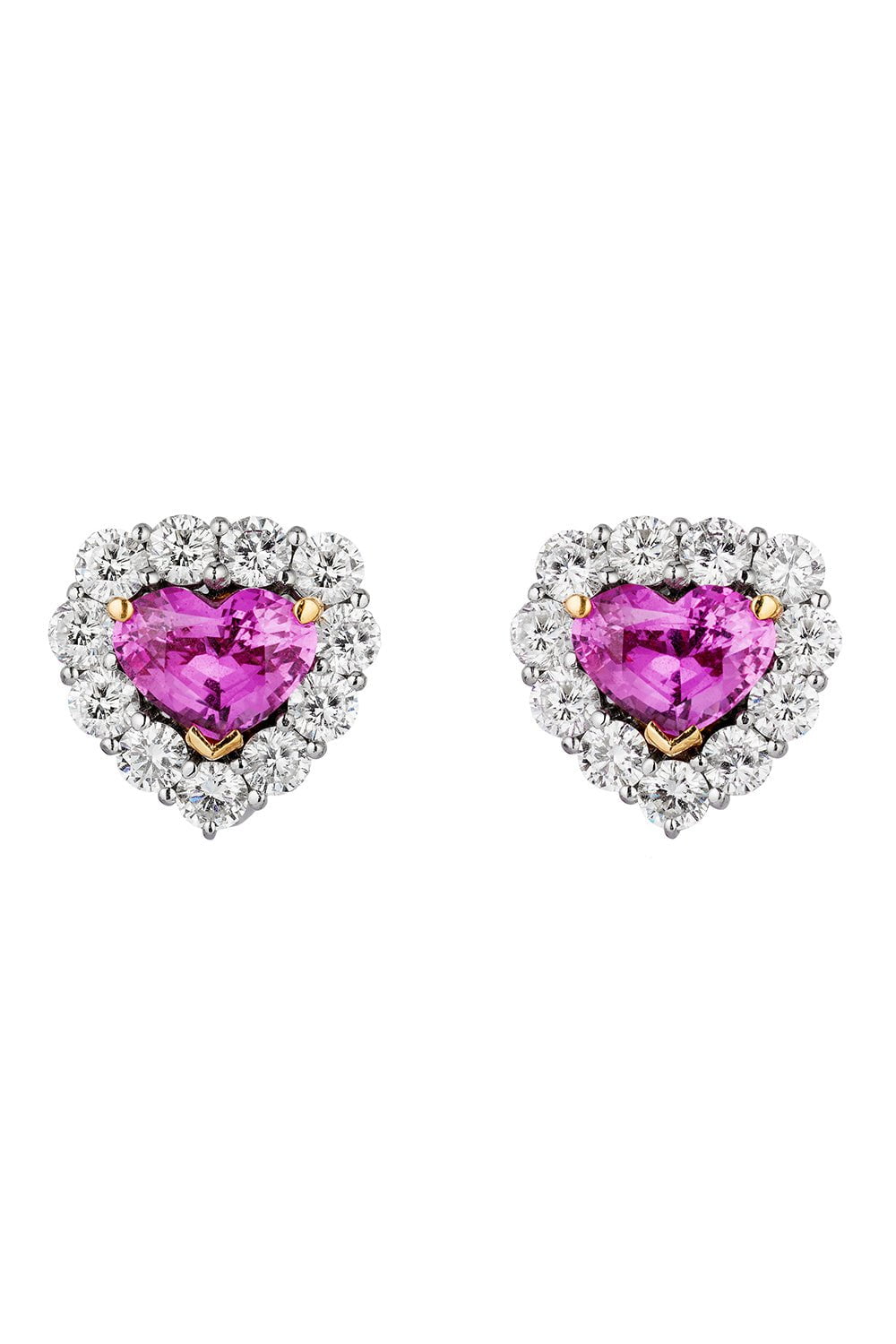 Bayco pink sapphire diamond heart stud earrings in platinum.
