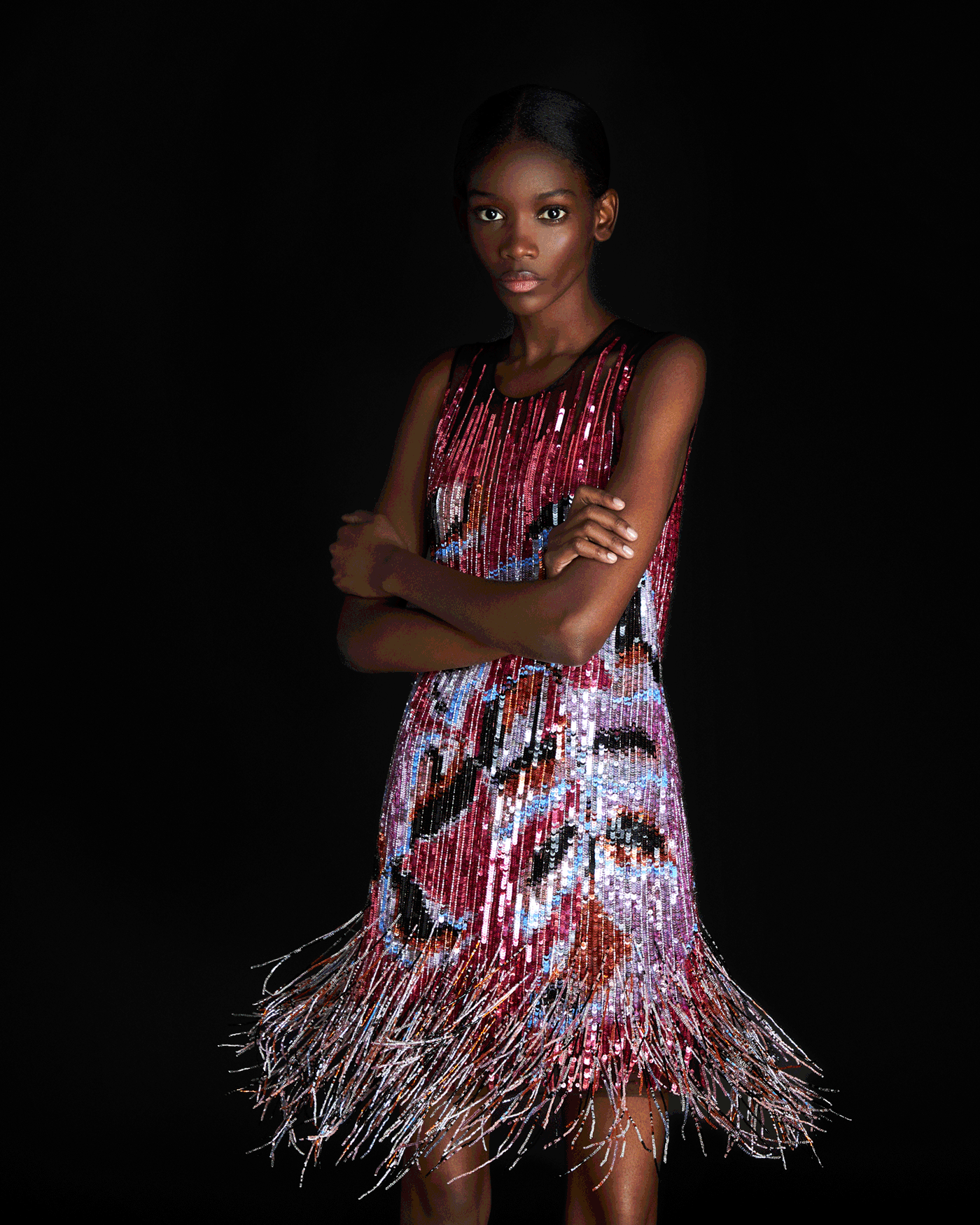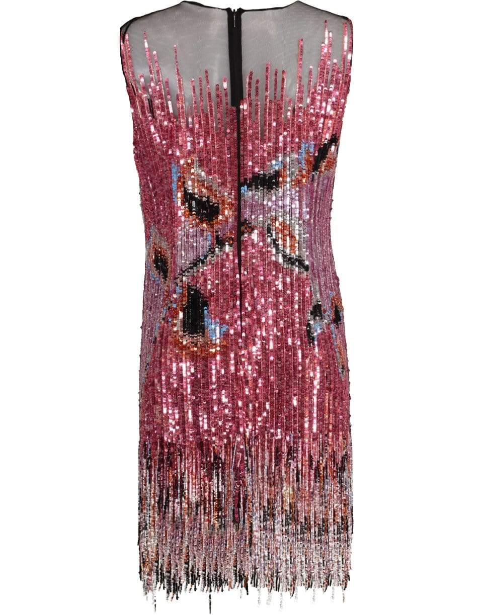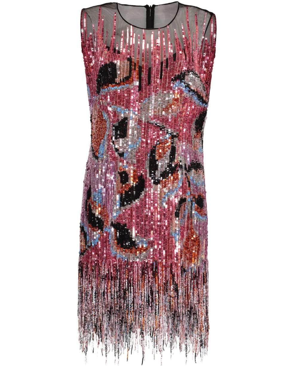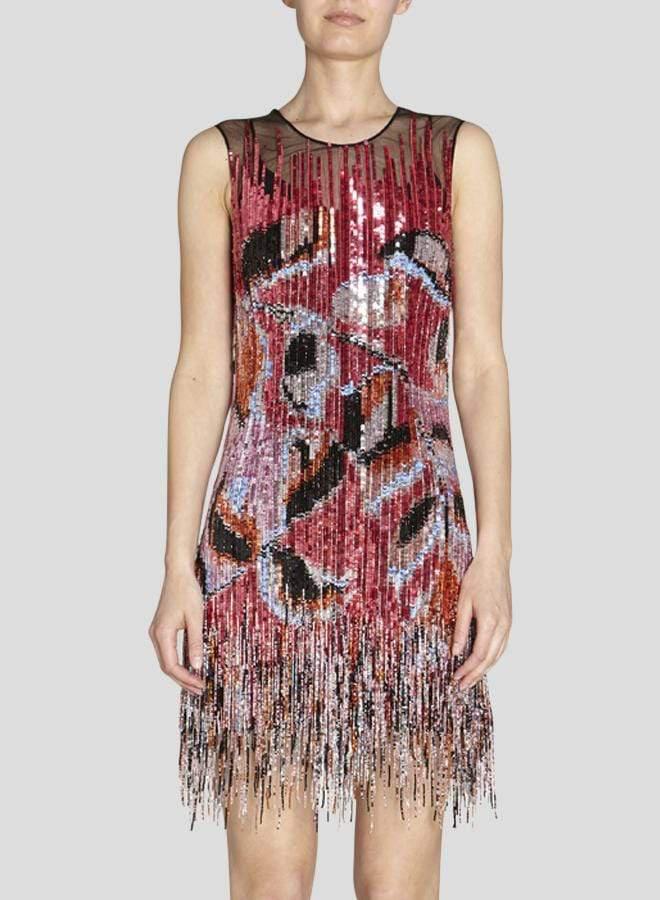 Beaded shift dress from Emilio Pucci featuring a slim fit, round neckline, sleeveless cut, exposed zip closure at back, mini length, and finished with sequin detail and beaded fringe.