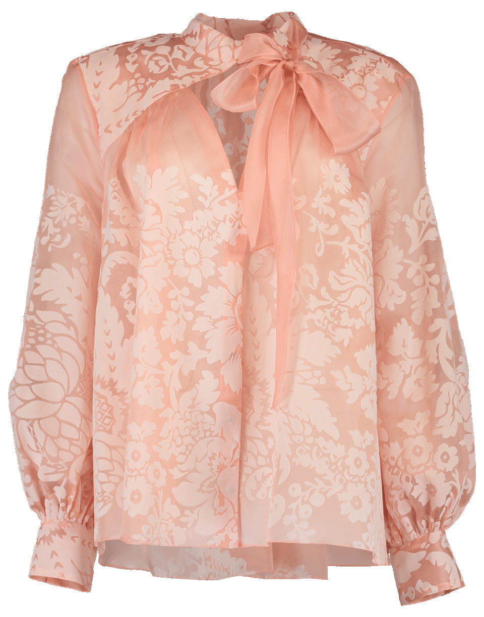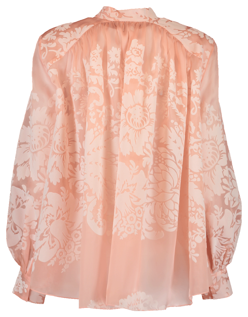 This relaxed sheer blouse by Rosie Assoulin is embellished with a floral motif throughout. It features long-sleeves, a snap closure, ribbon neck tie that can be worn loose or tied, a pleated flowy back, elegant balloon sleeves, high collar neckline and buttoned cuffs.