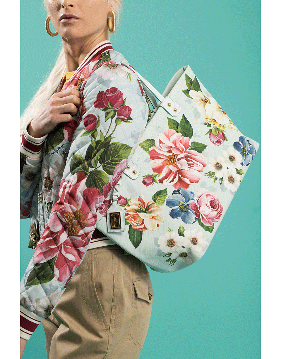 Dolce & Gabbana canvas Beatrice floral print shopping tote bag with leather double handles, removable logo plate, magnet closure, interior pocket, and a spacious main compartment.