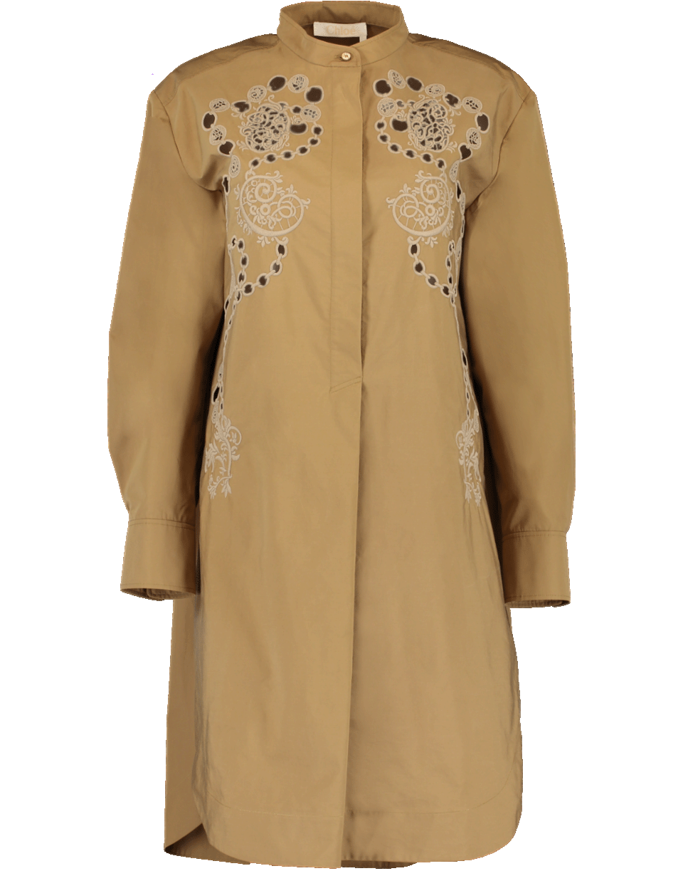 Belted shirt dress by Chloe. This embroidered shirt dress features long sleeves, a band collar, a concealed button placket, belted waist, embroidered details, a curved hem and a loose silhouette with a knee length cut.