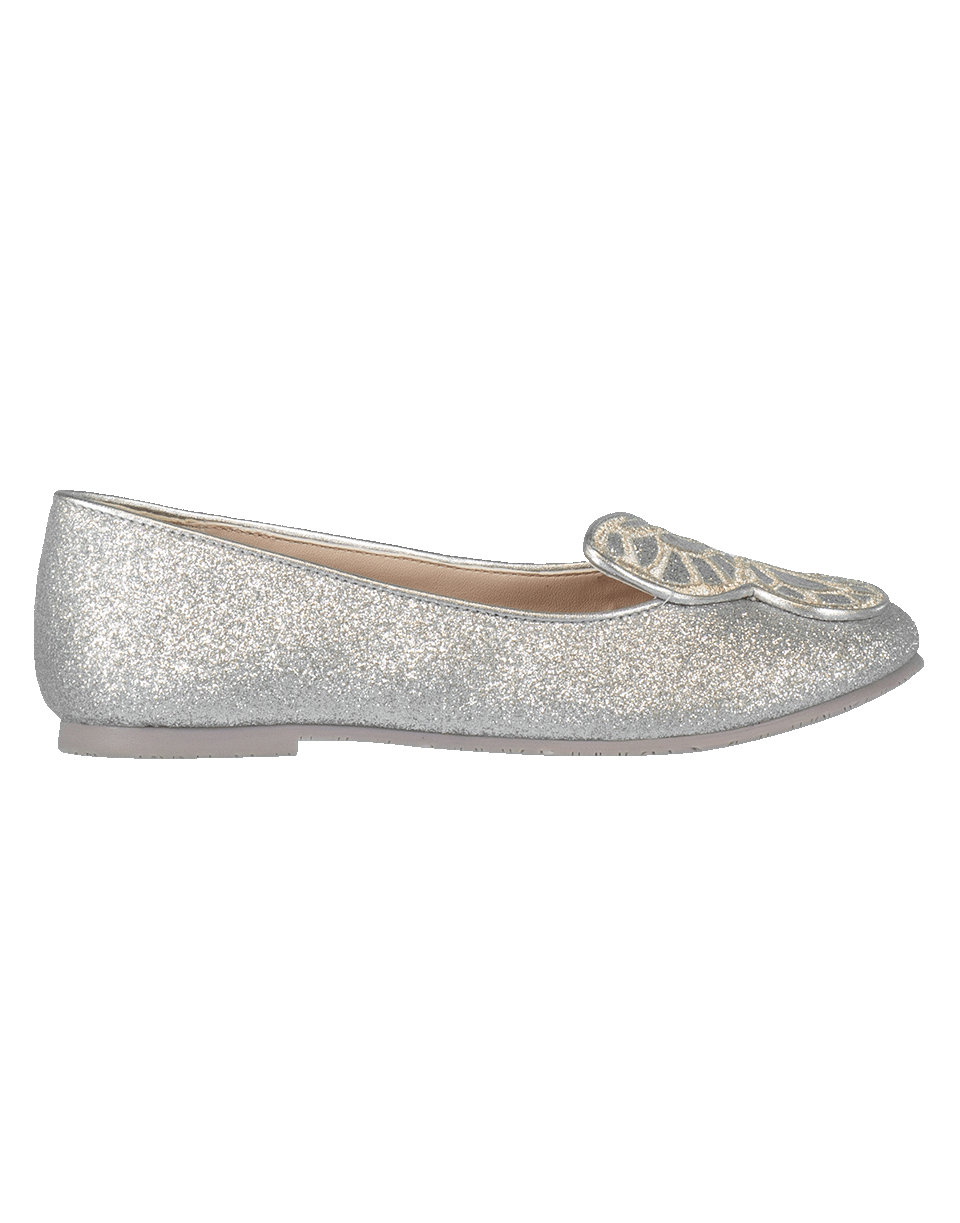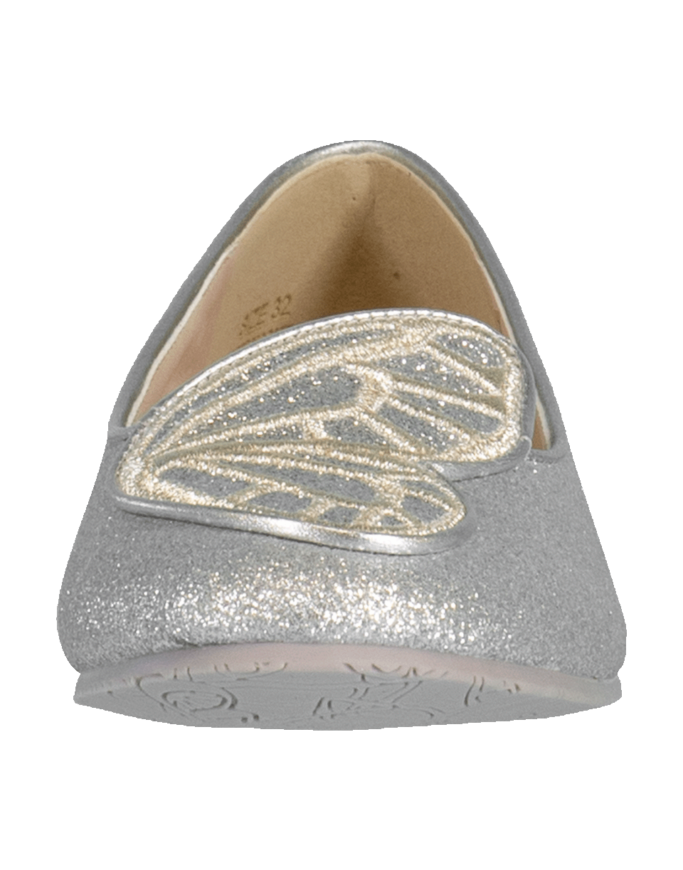 Bibi Butterfly junior by Sophia Webster. These leather flats feature a silver glitter upper with a round closed toe and a butterfly wing embroidery on each shoe.