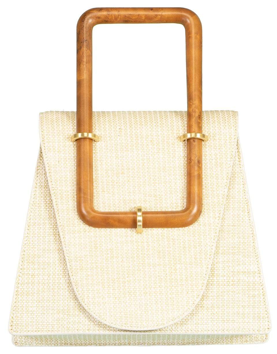 Cult Gaia Bibi top handle bag featuring a structured design with a wooden handle, magnetic flap closure, and an interior side pocket.