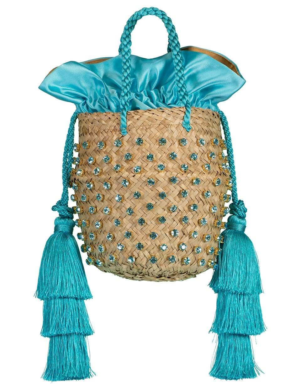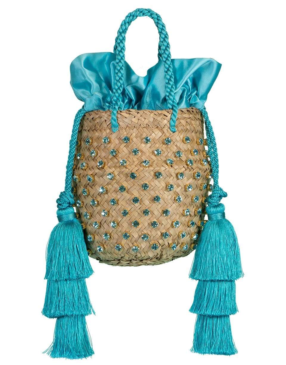 Le Nine Carol Starshell raffia basket bag with long turquoise tiered tassels, shell and crystal detail, double top handles, and an interior drawstring bag.
