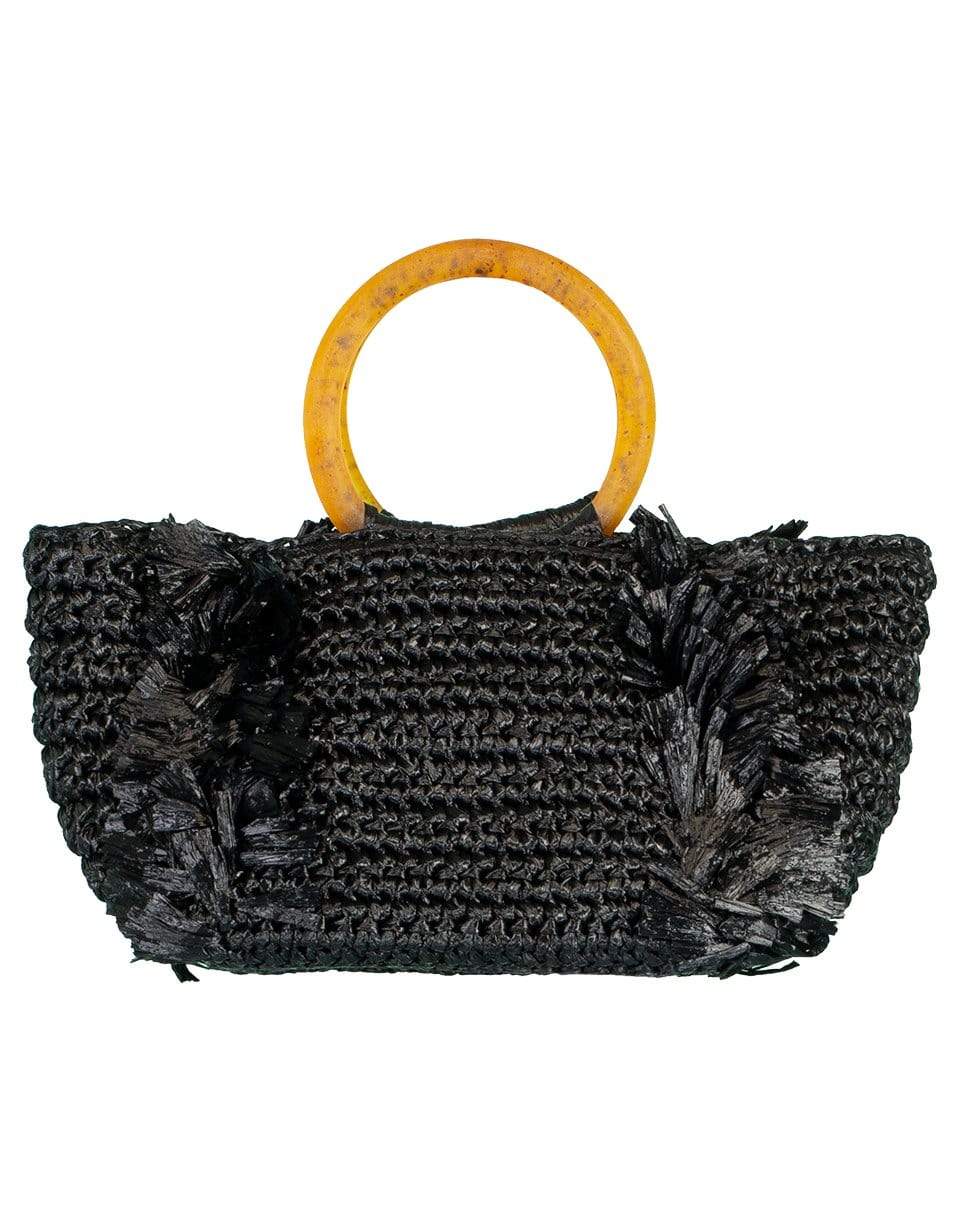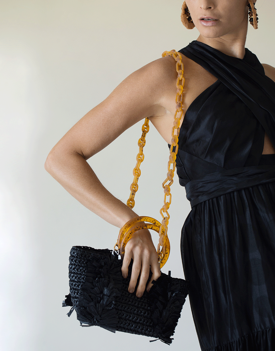 Carolina Santo Domingo Corallina crocheted raffia top handle bag finished with resin and lucite handles and chains that are crafted to resemble horn, ivory and amber. With an interior zip pocket and flexible fabrication.