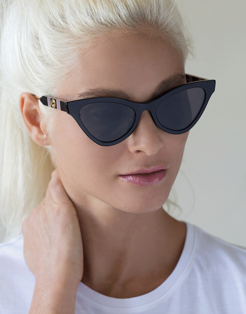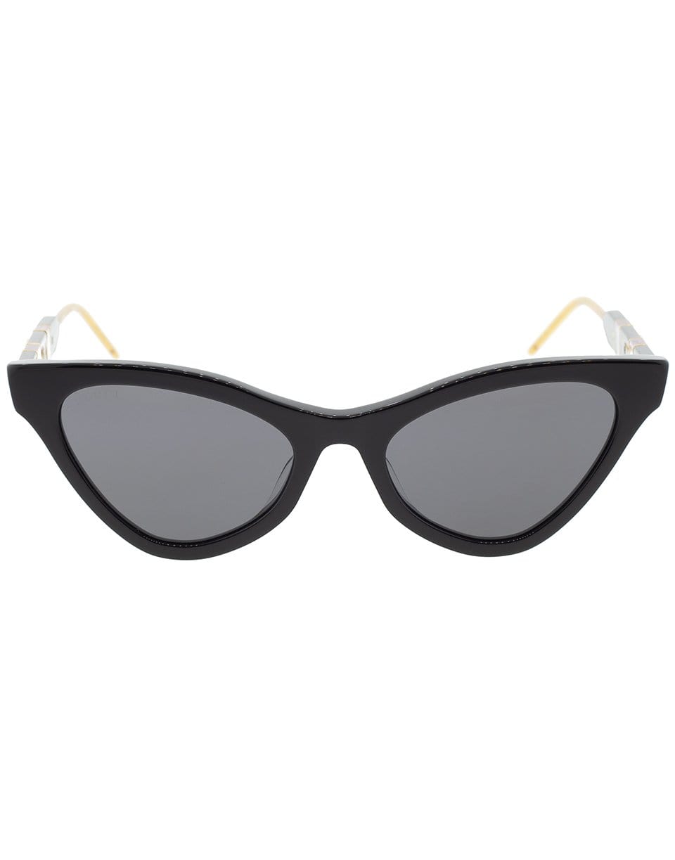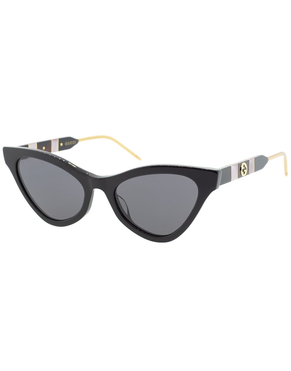 Gucci black cat-eye sunglasses with an acetate frame and grey lenses.