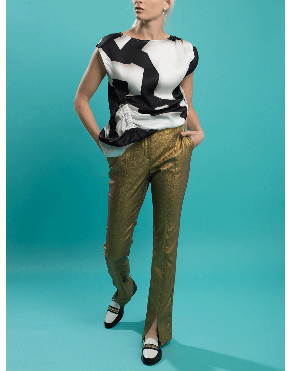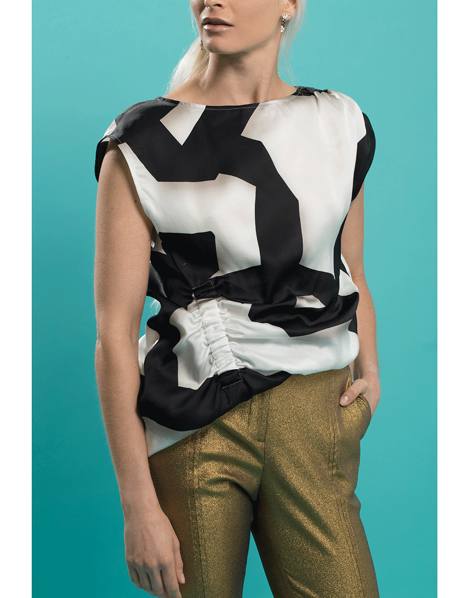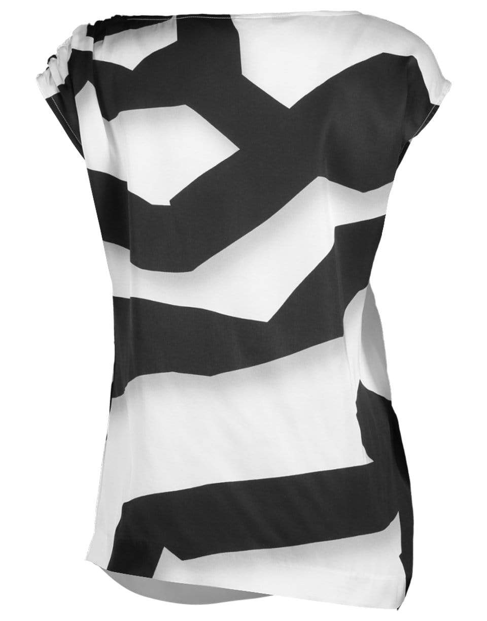 Dries Van Noten black and white Ceto striped top with a regular fit, cap sleeves, boatneck, hem zip closure, and gathered detail at shoulder and waist.