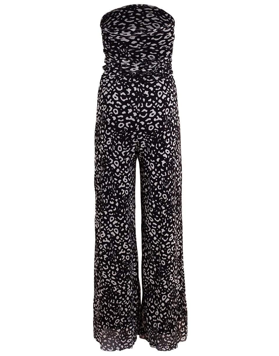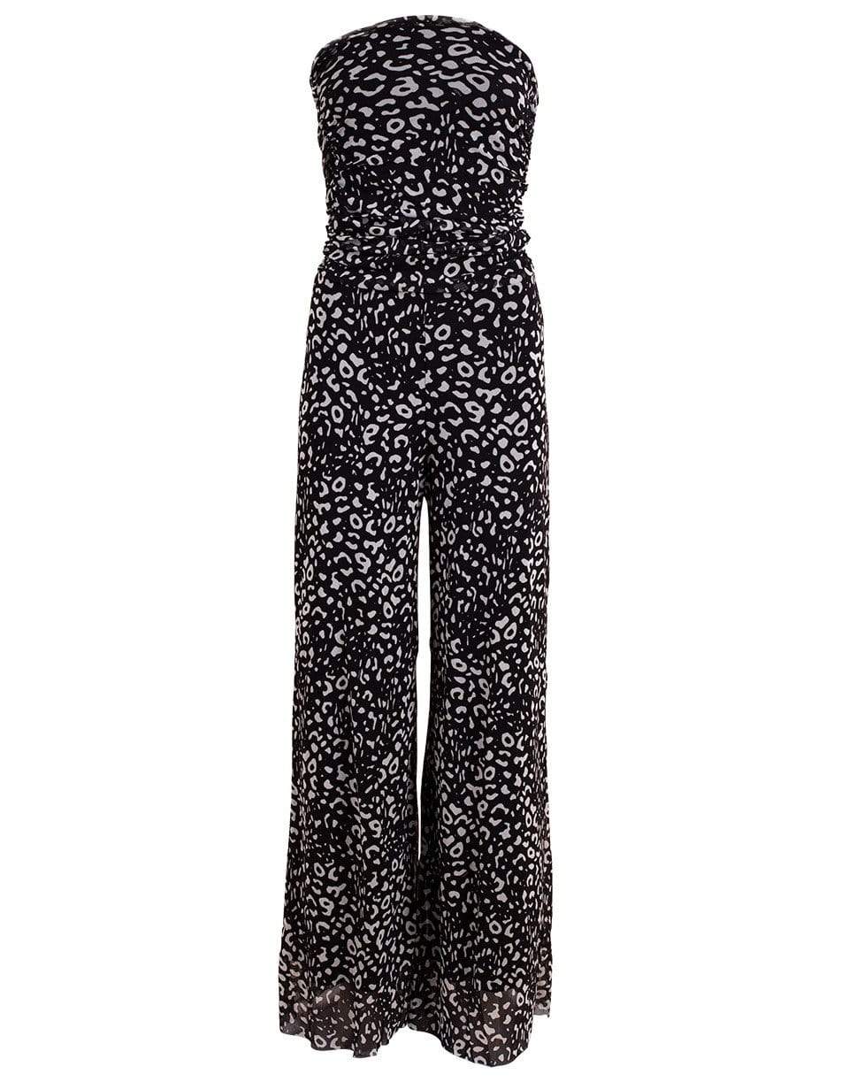 Fuzzi neon floral print strapless jumpsuit features a slim fitting ruched bodice with a flare pant leg.