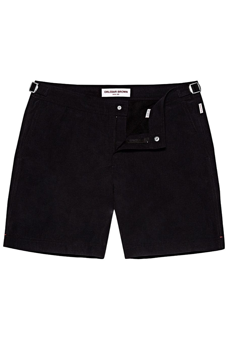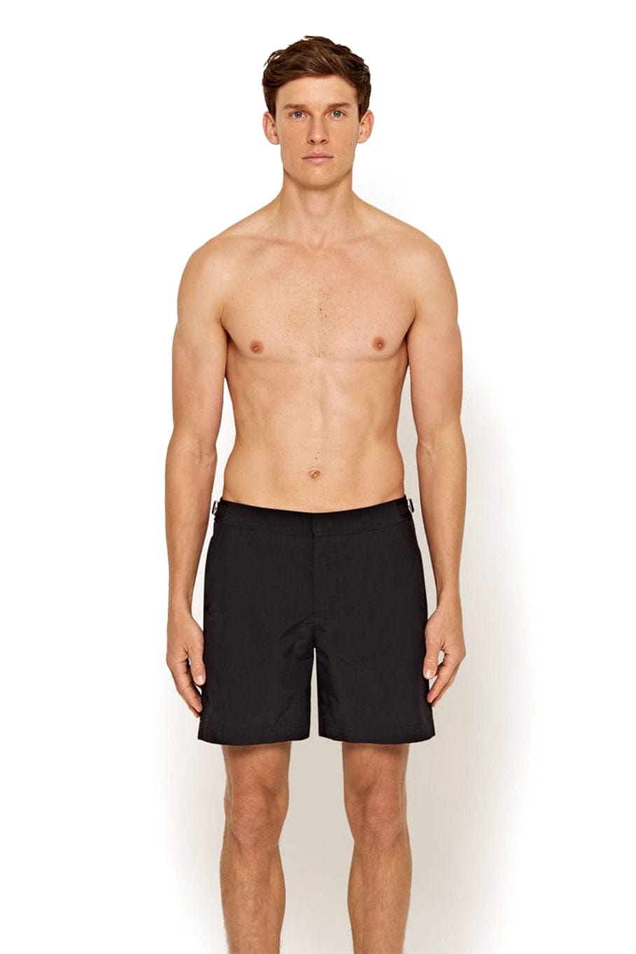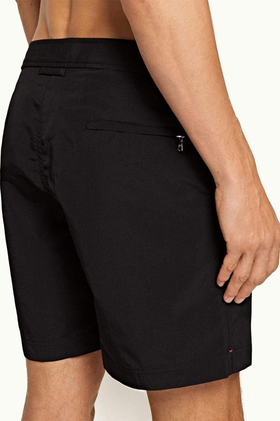 Black Bulldog mid-length swim shorts by Orlebar Brown featuring a tailored fit with quick-drying polyamide fabric, concealed front zip and button, back pocket with zip and adjustable metal side fasteners for desired fit.