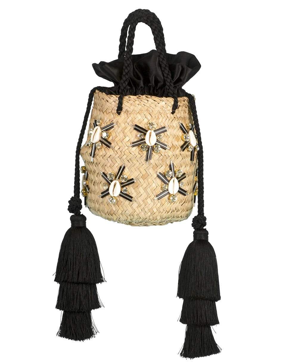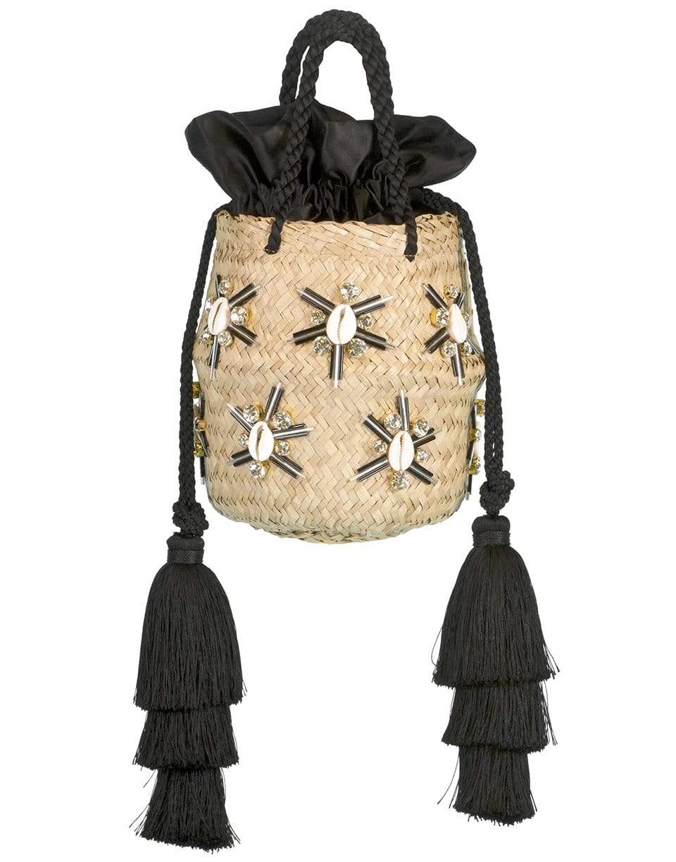 Le Nine Carol Starshell raffia basket bag with long black tiered tassels, shell and crystal detail, double top handles, and an interior drawstring bag.