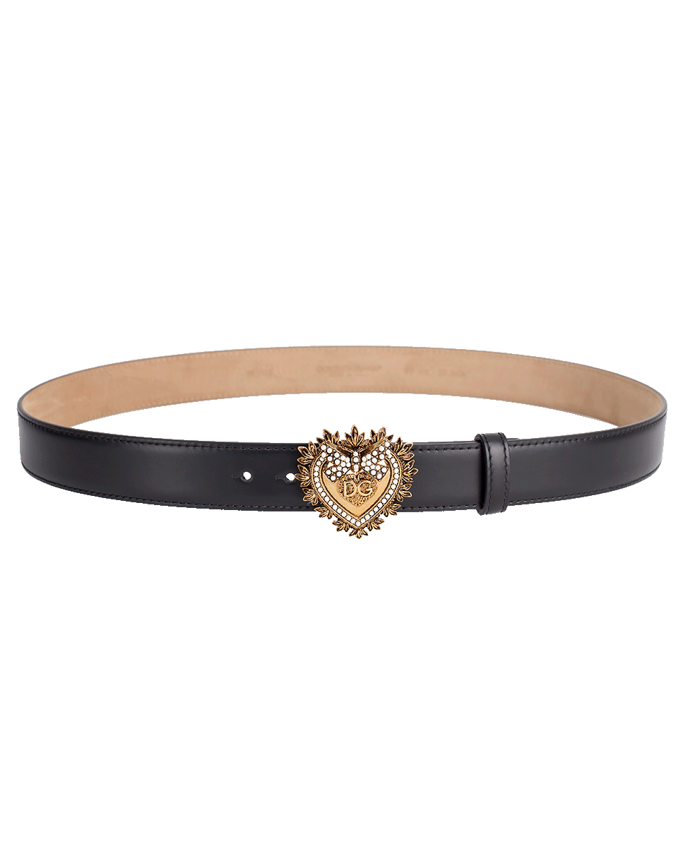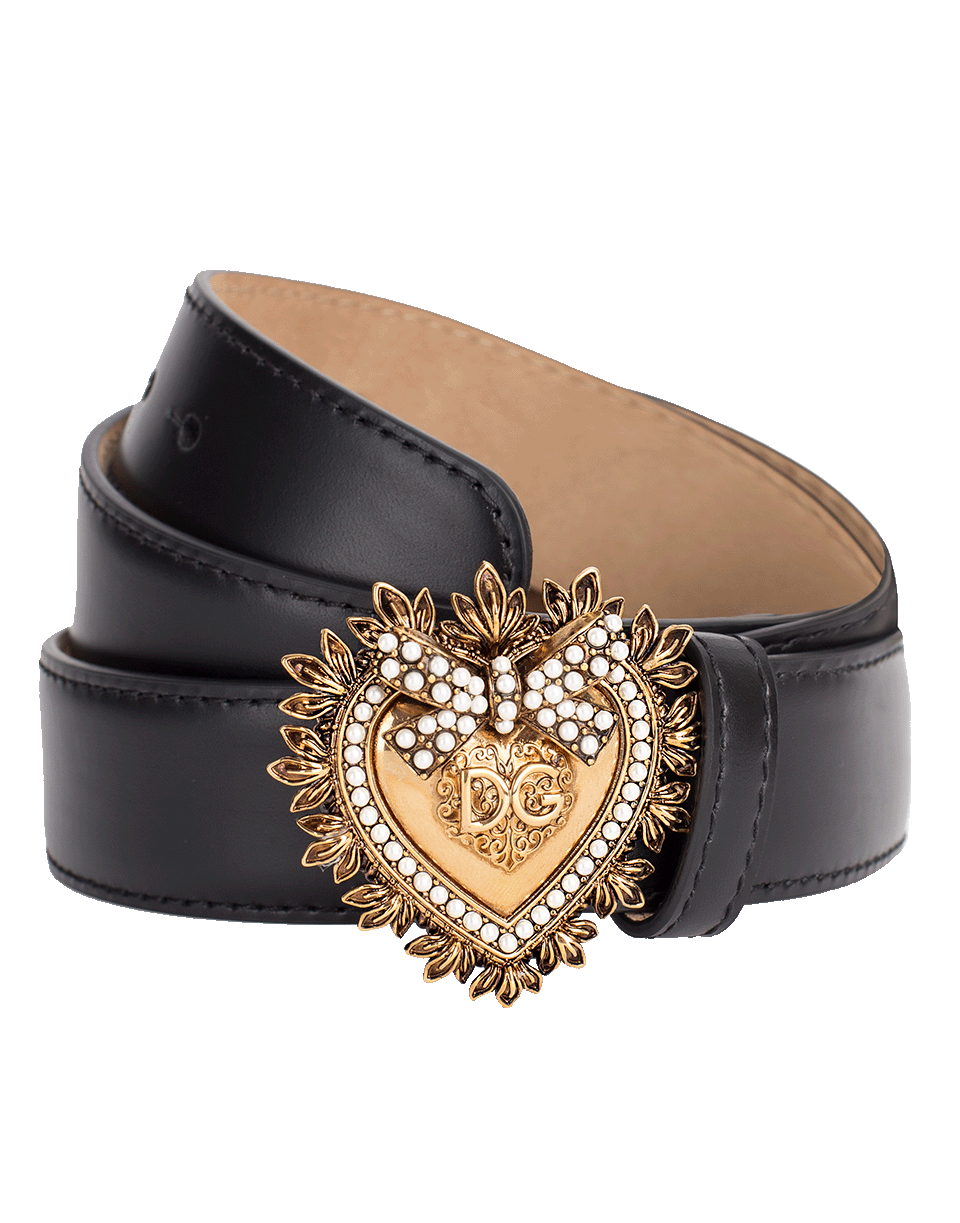 This black Devotion belt by Dolce & Gabbana is crafted from calf leather and features an adjustable fit, gold-tone hardware, and a branded bejeweled heart buckle with pearl details.
