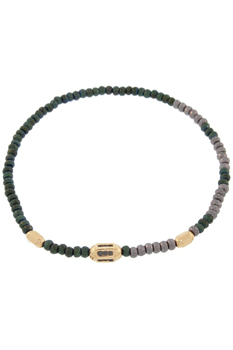 Luis Morais 14k yellow gold small hexagon bolt bead with black diamonds and two small hexagon bolts on a beaded bracelet.