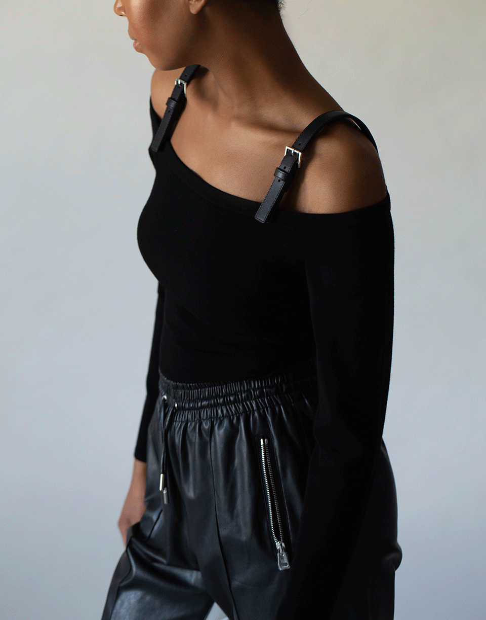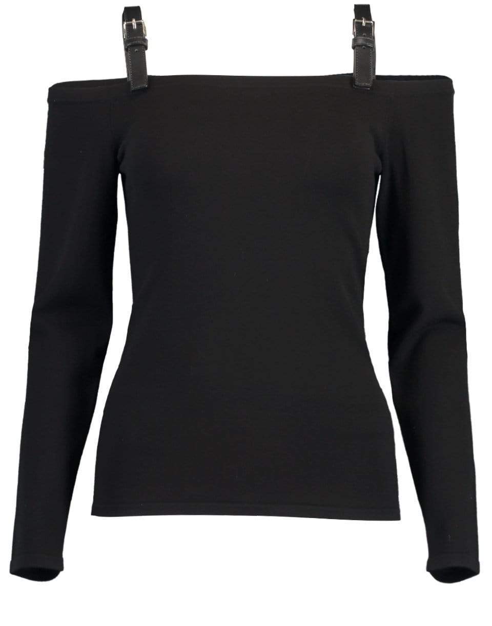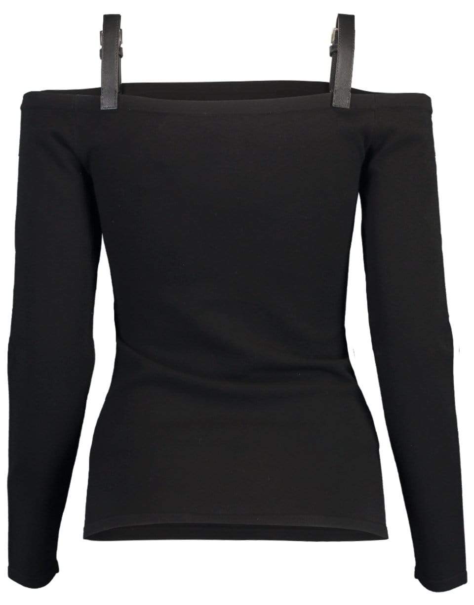 Michael Kors leather trim stretch viscose off shoulder top with long sleeves and a slim fit.