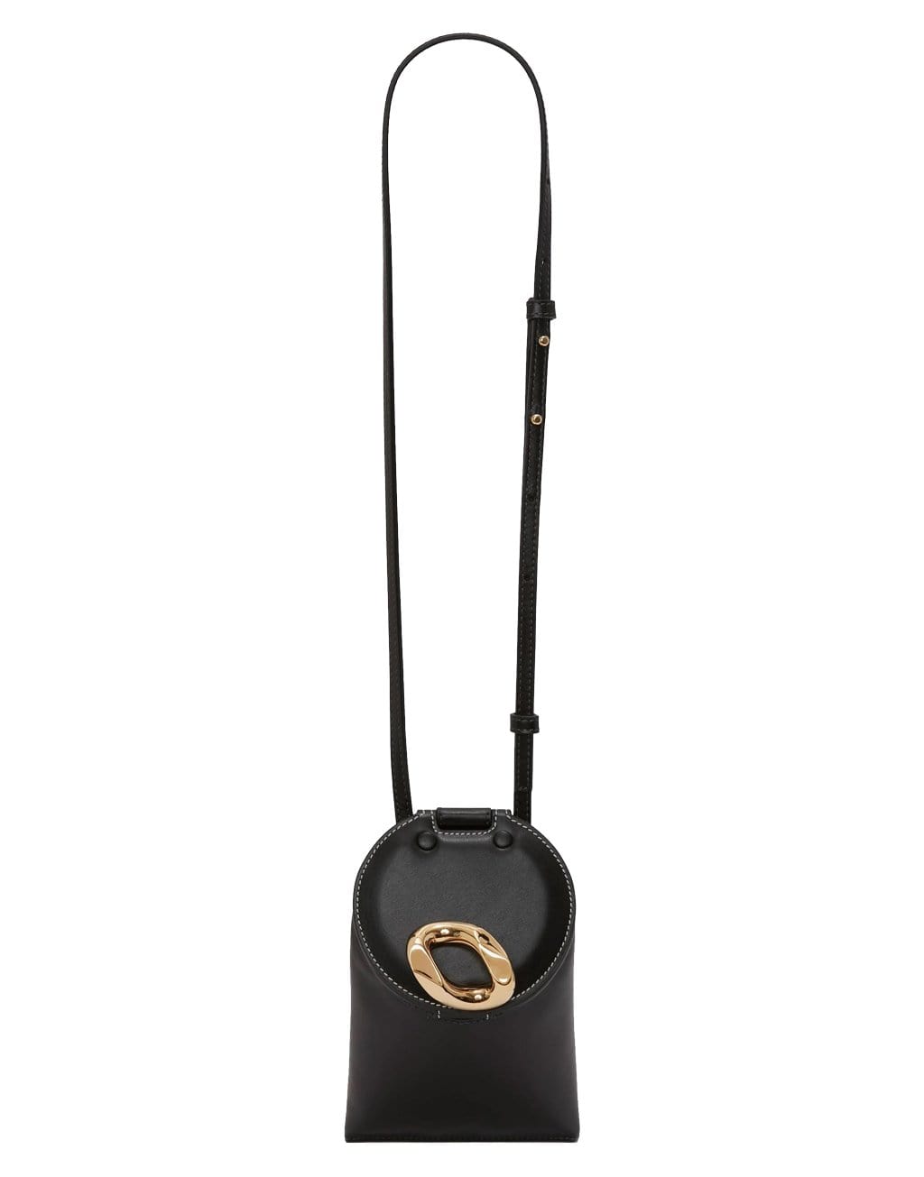 JW Anderson lid pocket shoulder bag in black. Chain link hardware detail, flap closure with magnet, and oversized link detail on flap. Interior slip pocket, adjustable strap, JWA logo, blind embossing, structural round wire construction. Can be worn cross-body or as a necklace.