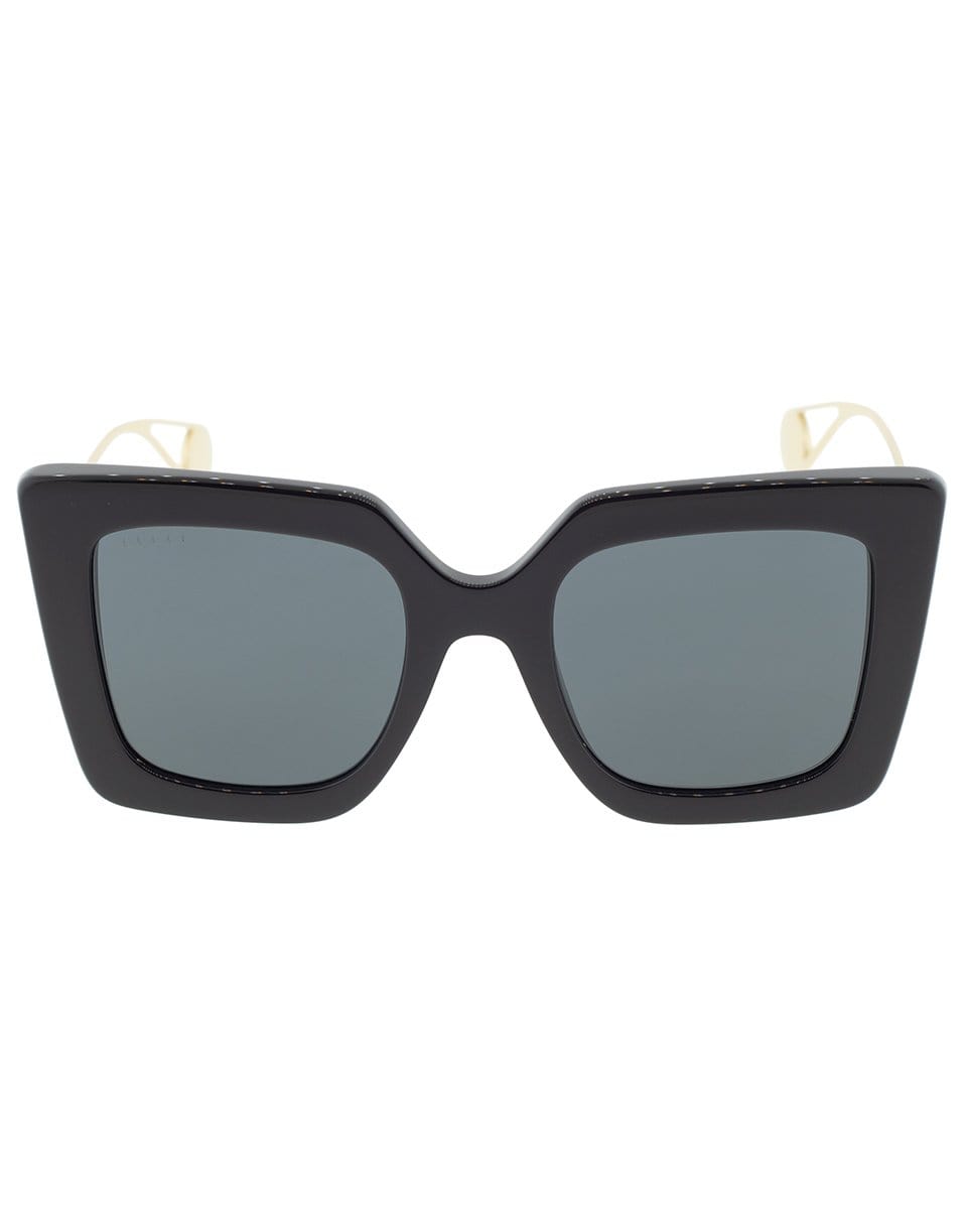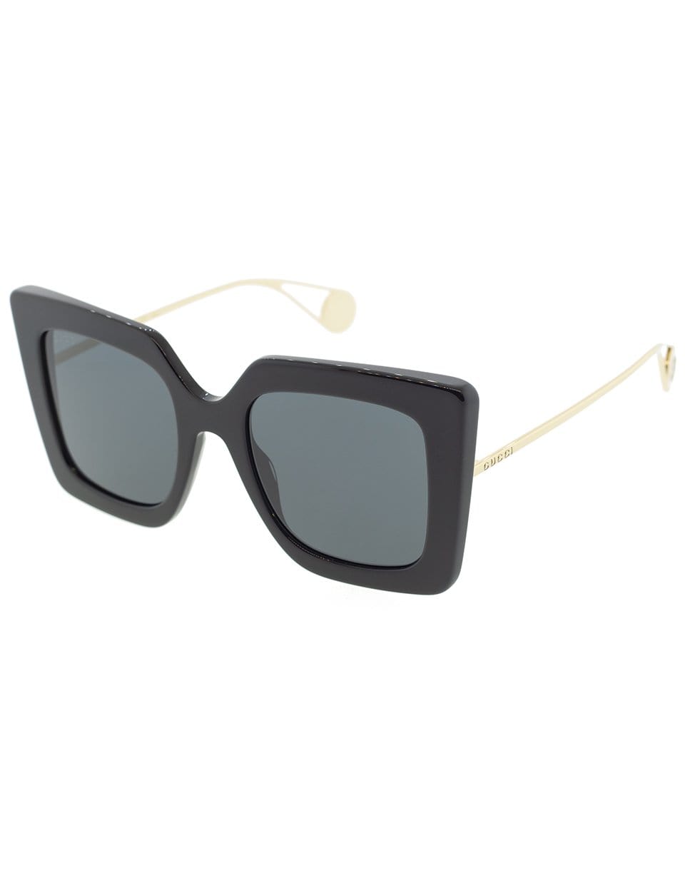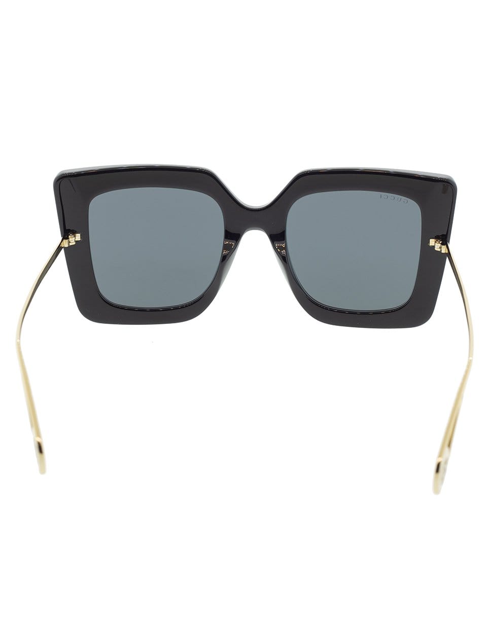 Oversized Gucci black shiny sunglasses with a full rim acetate frame, grey lenses, gold hardware, and square shape.