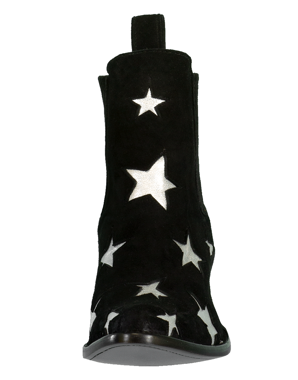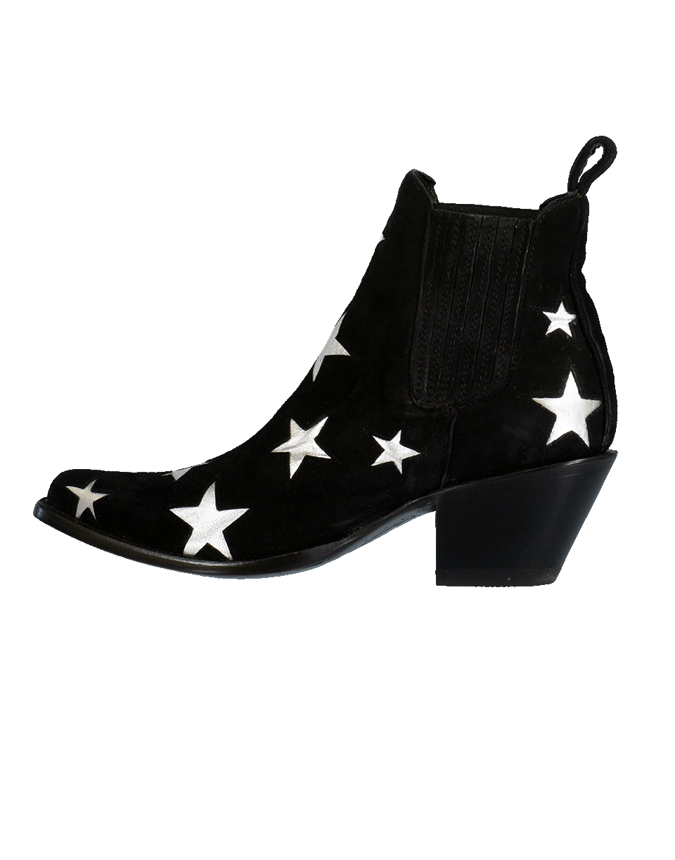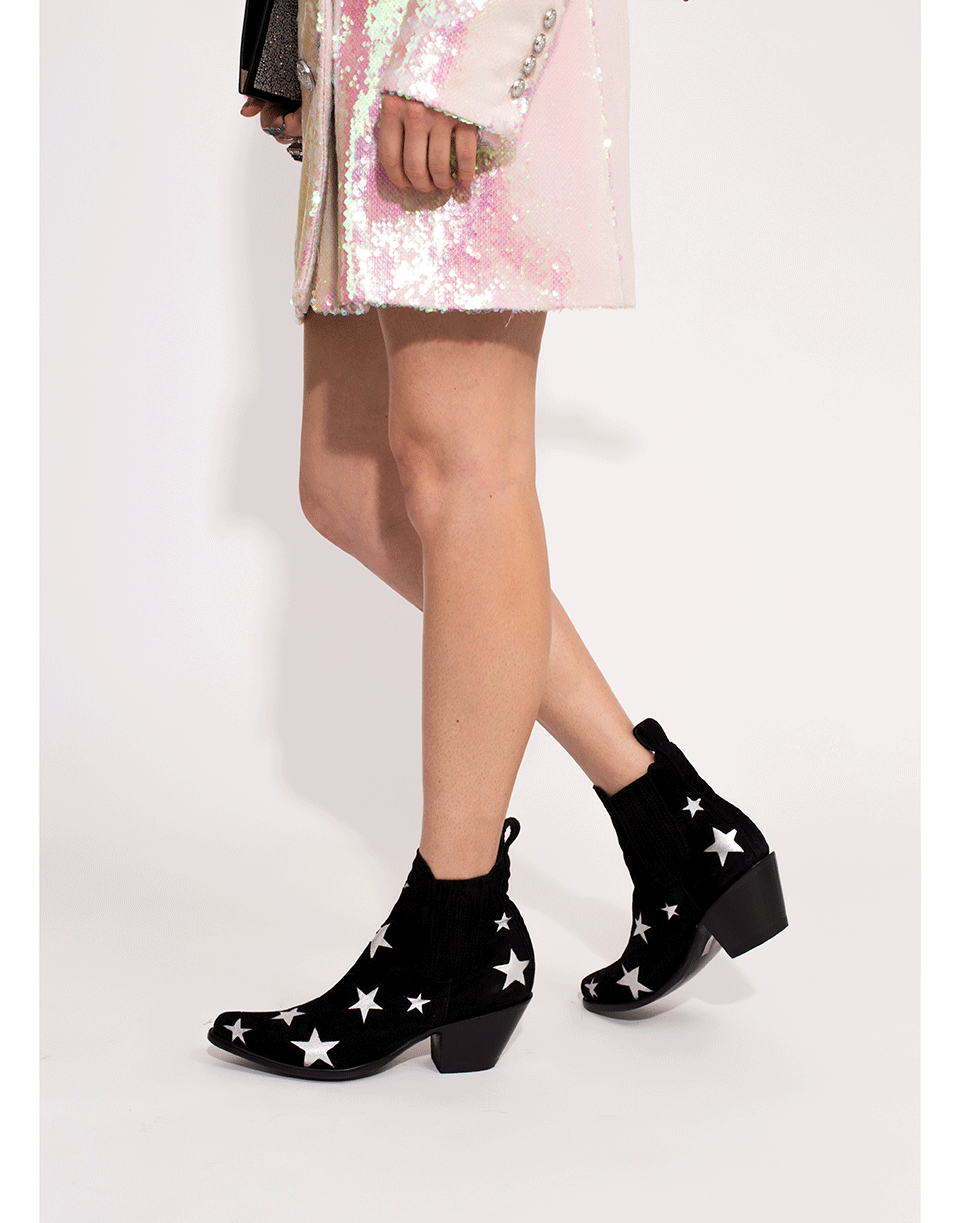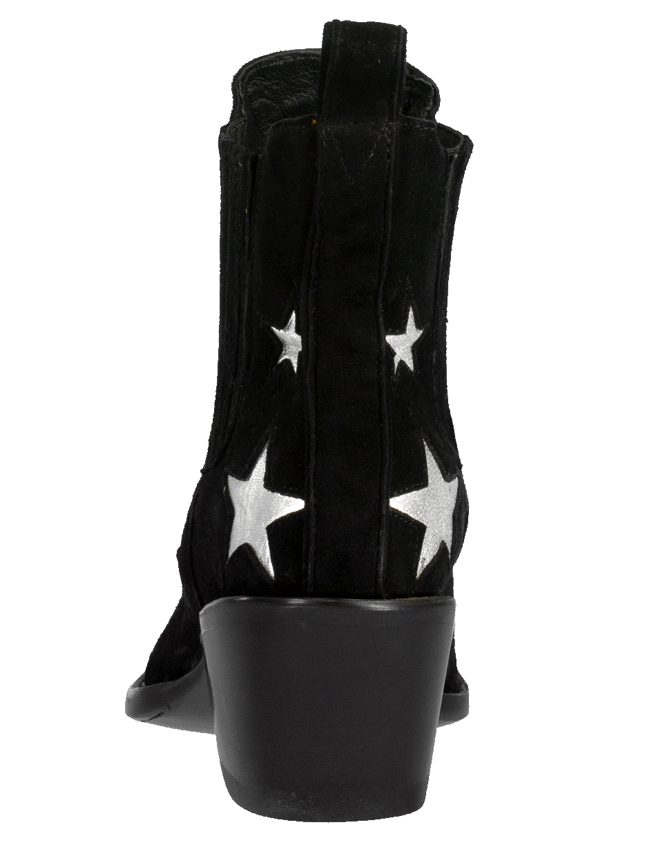 Black leather ankle boots by Mexicana. These boots feature a round toe, 3” heel, canvas silver star embroidery and a back-pull tab. All leather.