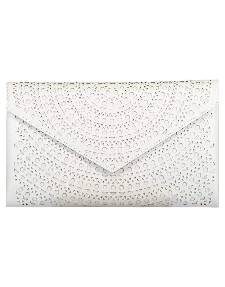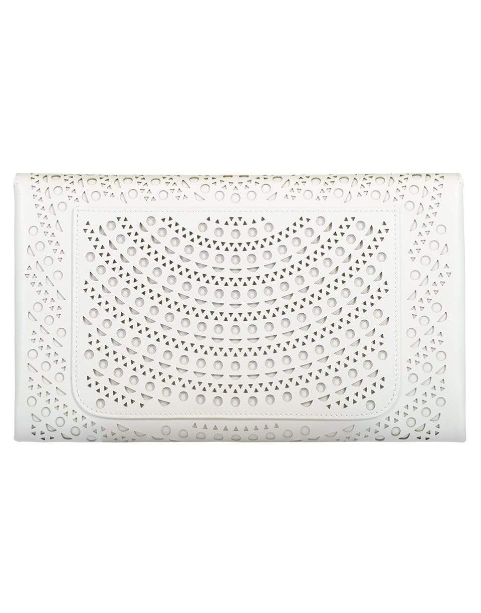 Alaia oum 26 leather envelope clutch features [erforated leather exterior with leather lining and gunmetal-tone hardware. Fold-over flap top closure with snap button fastening, back slot pocket, interior slot pocket, removable leather tassel with attached mirror.