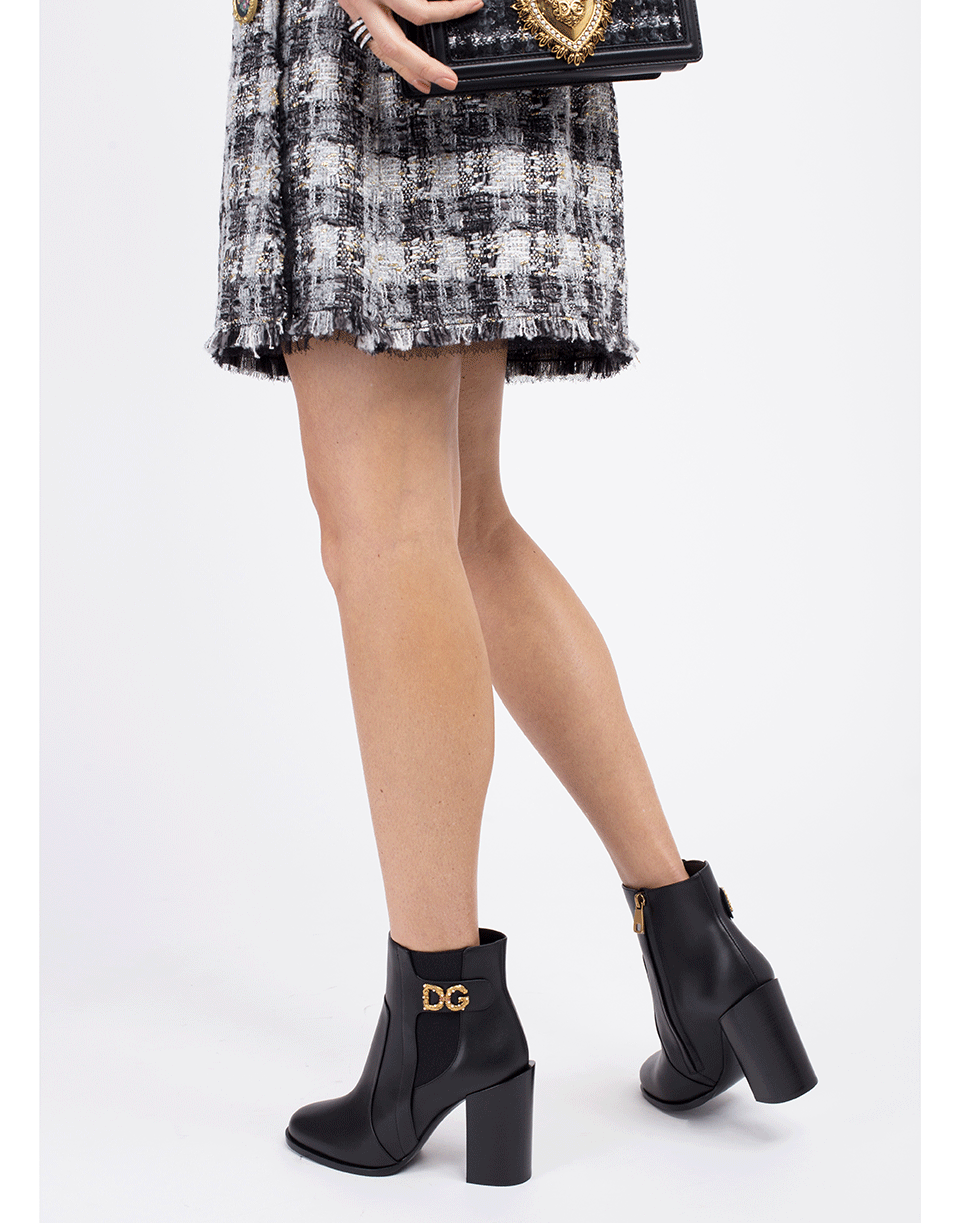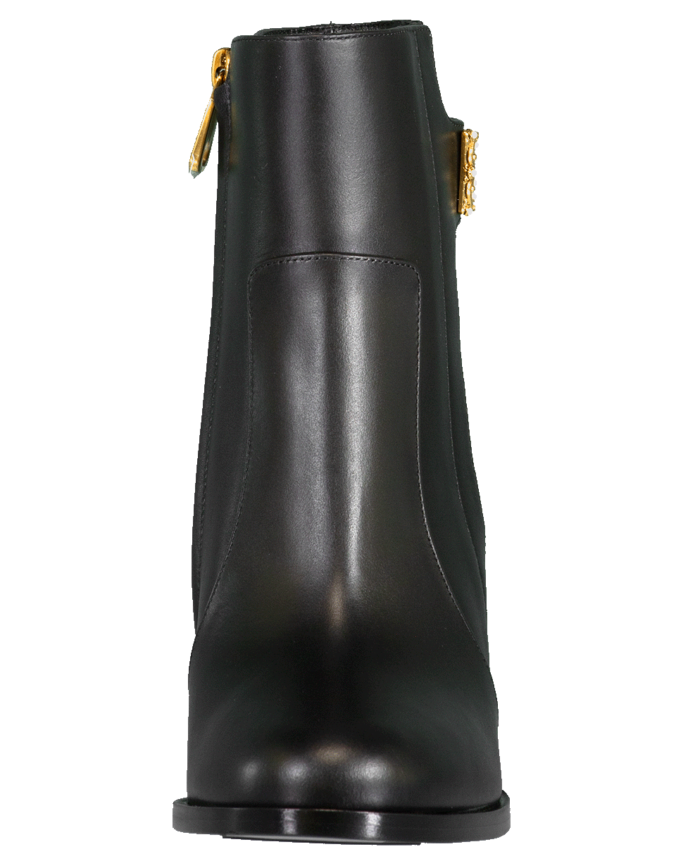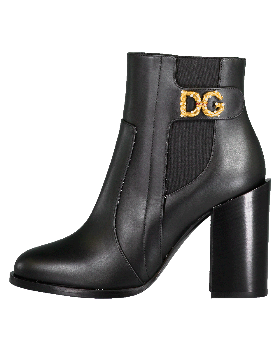 Black leather booties from Dolce & Gabbana with a 90mm block heel, round toe, zip closure, and a goldtone logo plaque on the side. All leather.