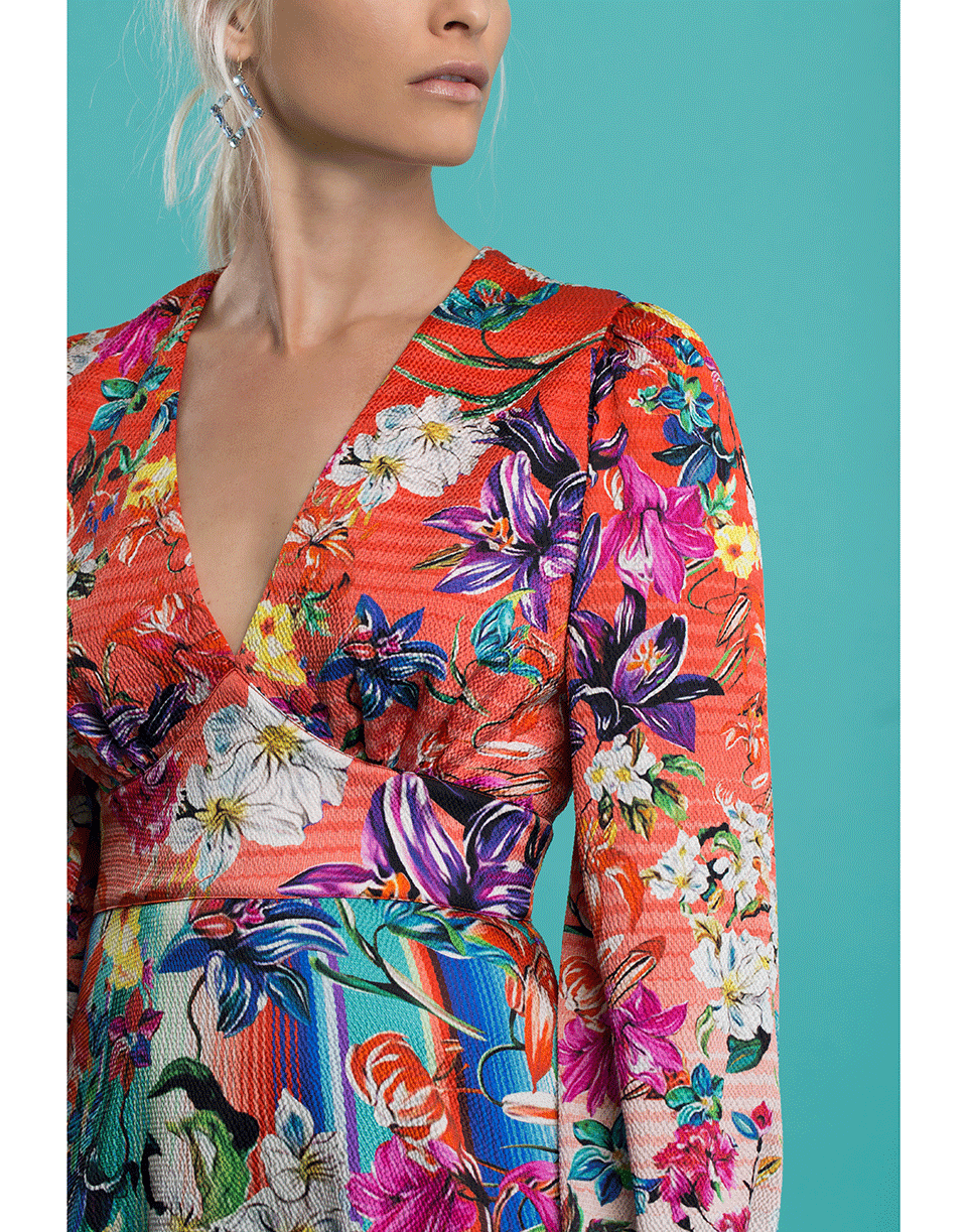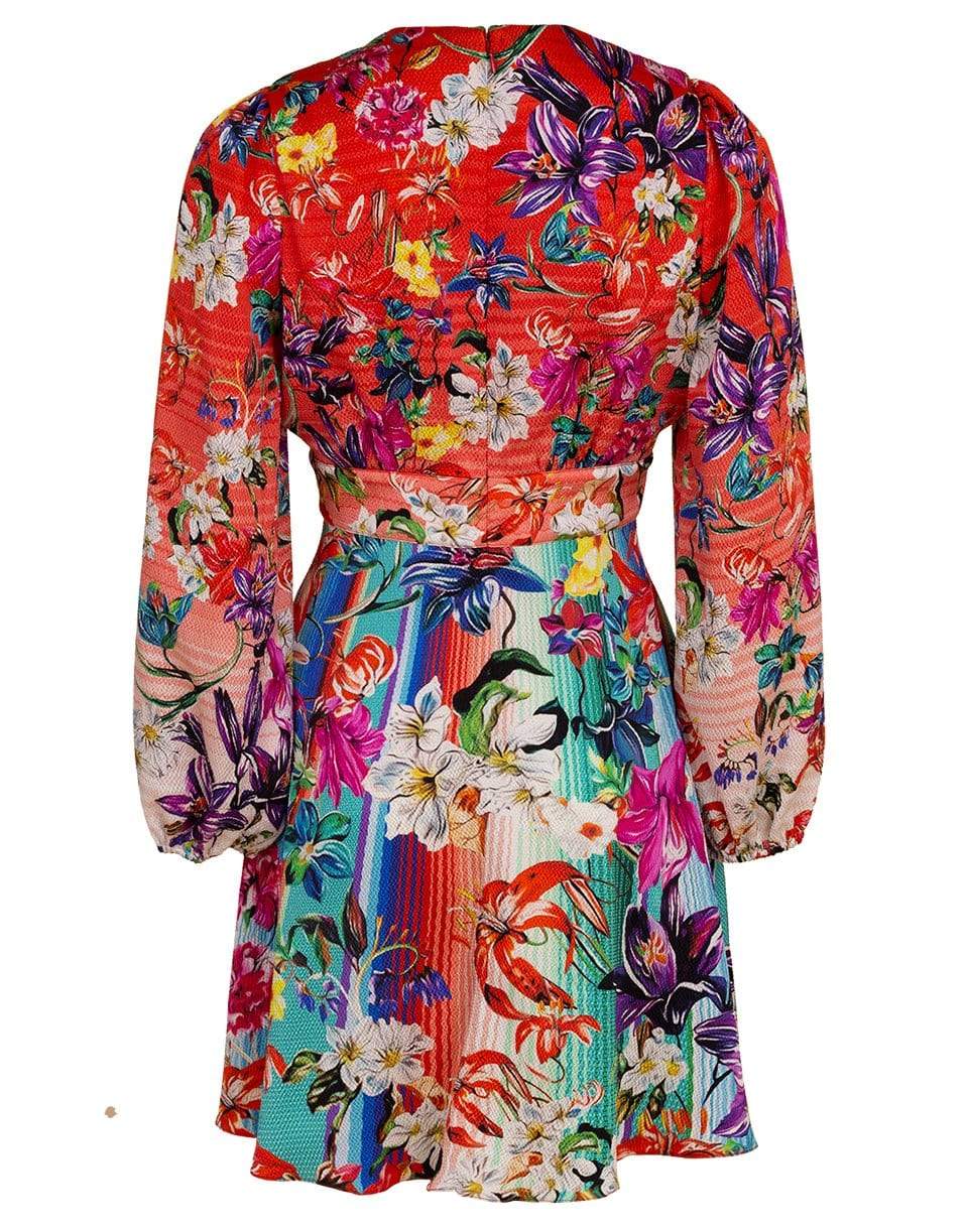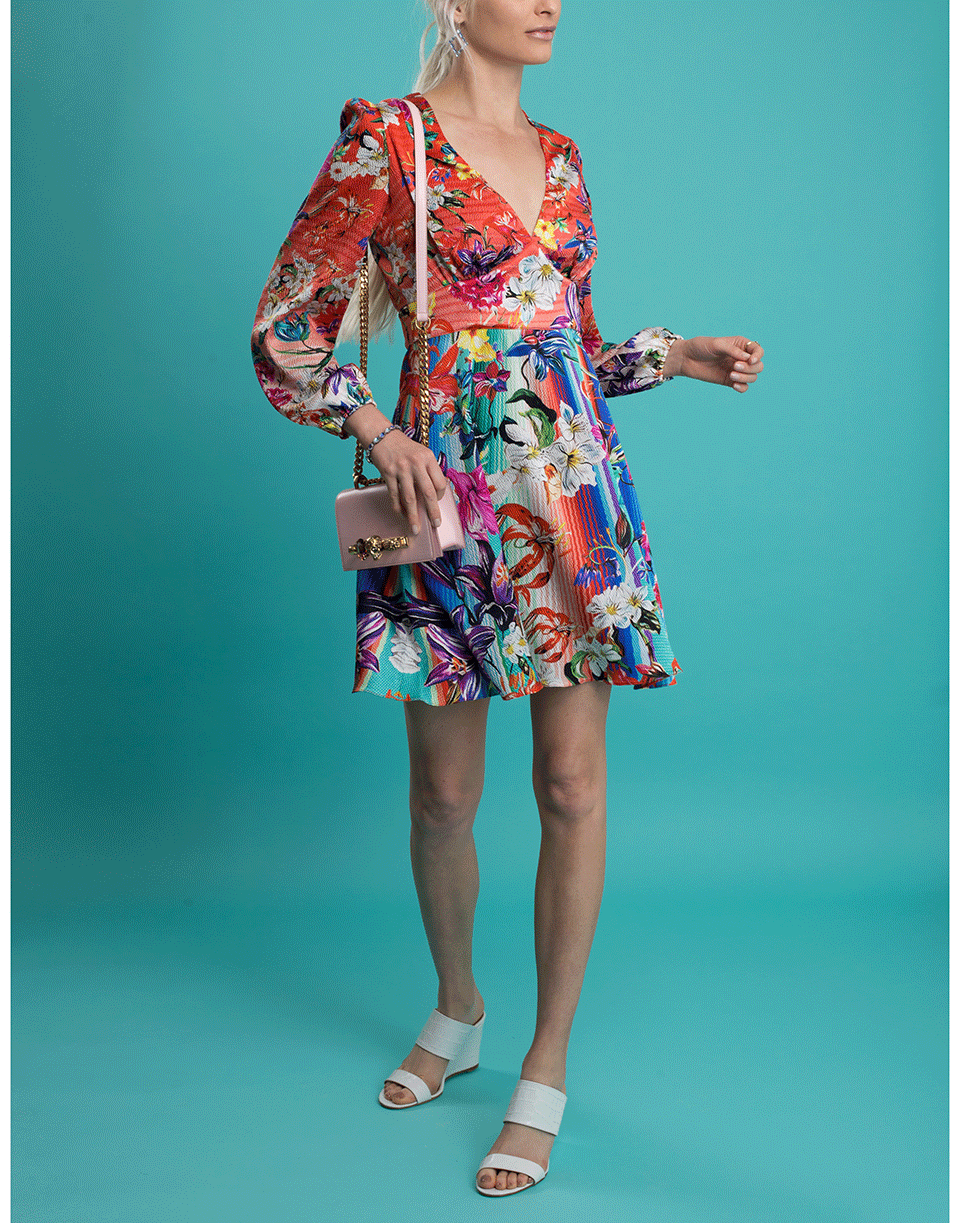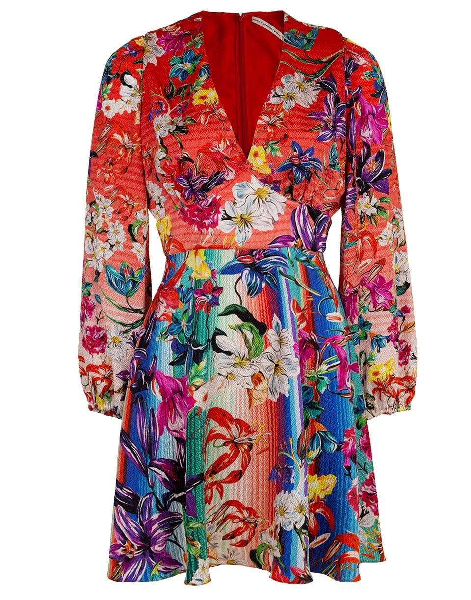 Mary Katrantzou hammered silk Bloom Dress with long sleeves, V-neck, fitted waist, concealed back zip, and a short length.