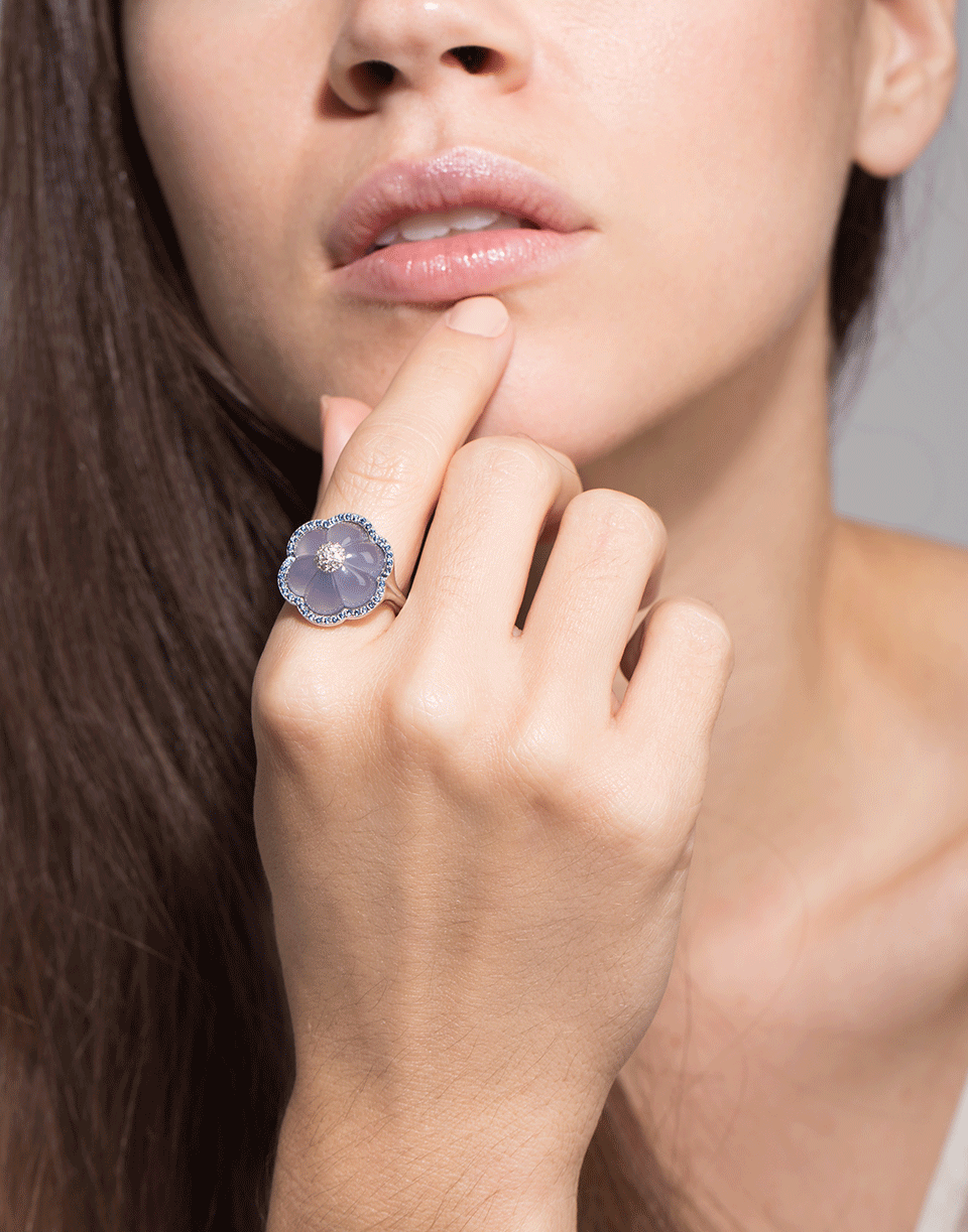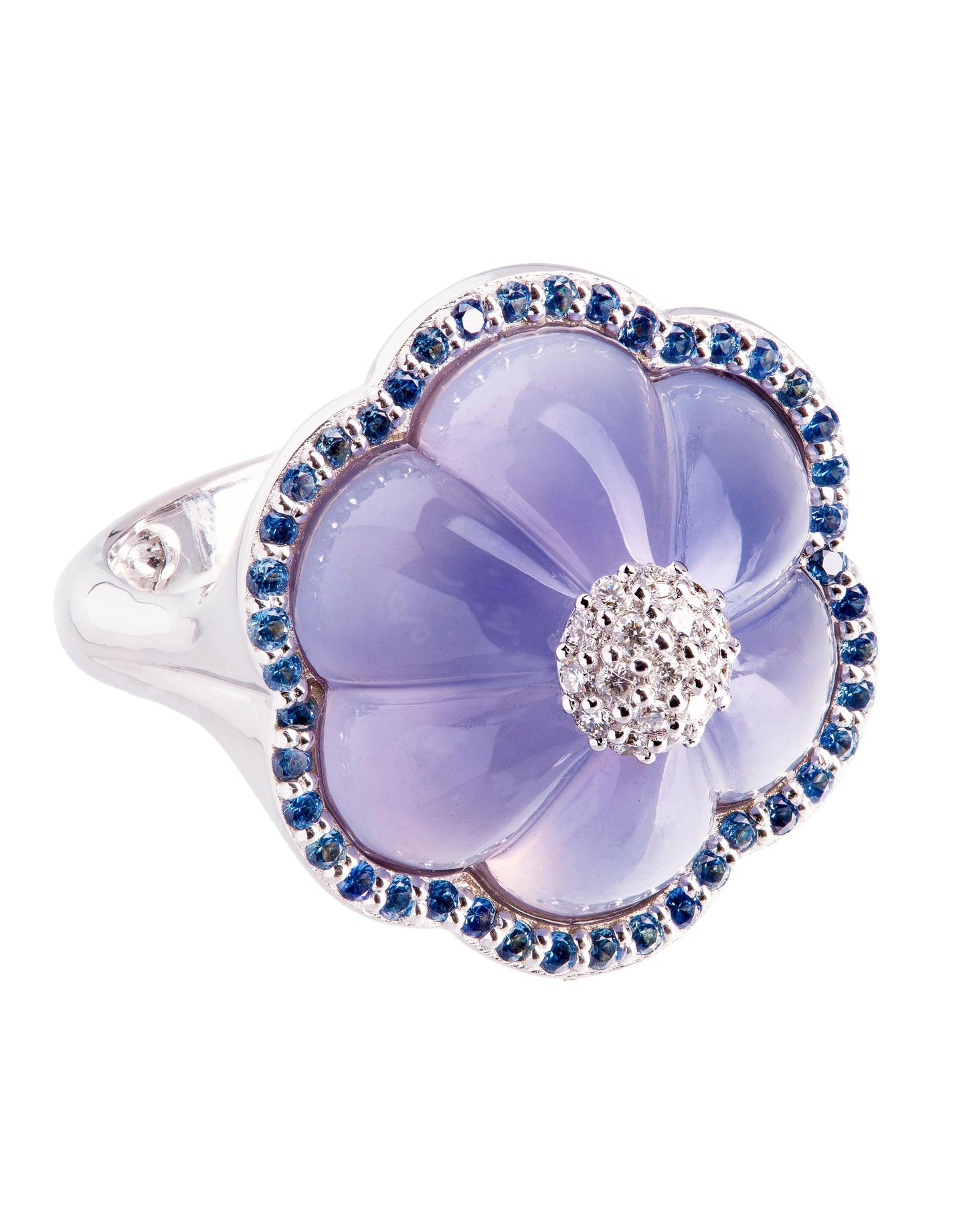 Guita M blue carved chalcedony ring with diamond center and blue sapphires.