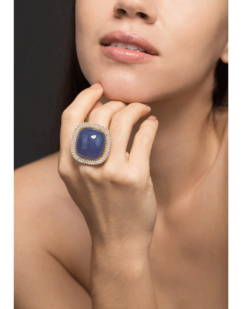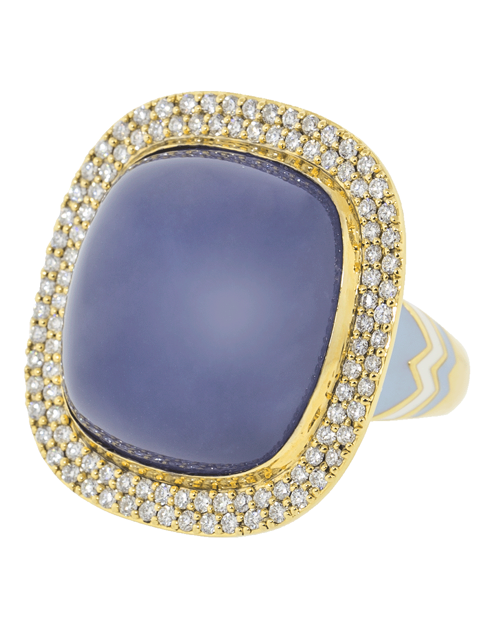 This 20k yellow gold statement ring from Buddha Mama features two rows of diamonds with a blue chalcedony gemstone in the center and an enamel base with flower diamonds on the sides.