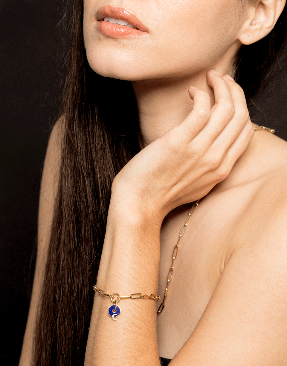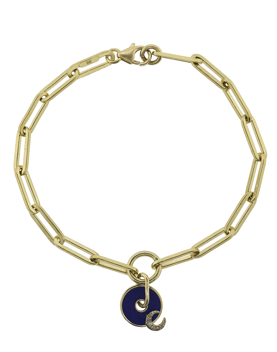 Blue Crescent charm fob clip bracelet by Foundrae. This clip bracelet is handcrafted from 18k yellow gold, it features a dainty blue champleve enamel gold disc fob with a diamond pavé moon crescent charm and a lobster clasp fastening.