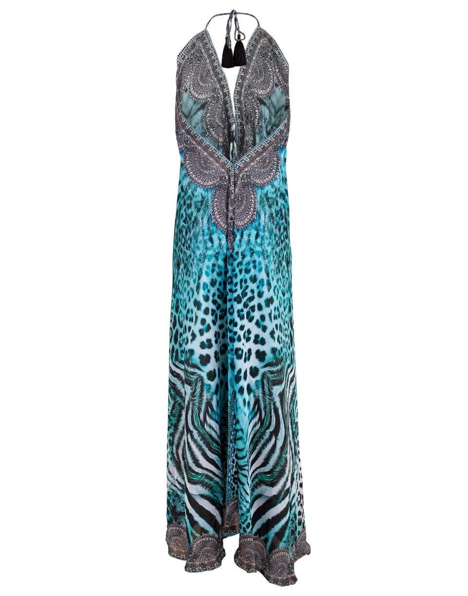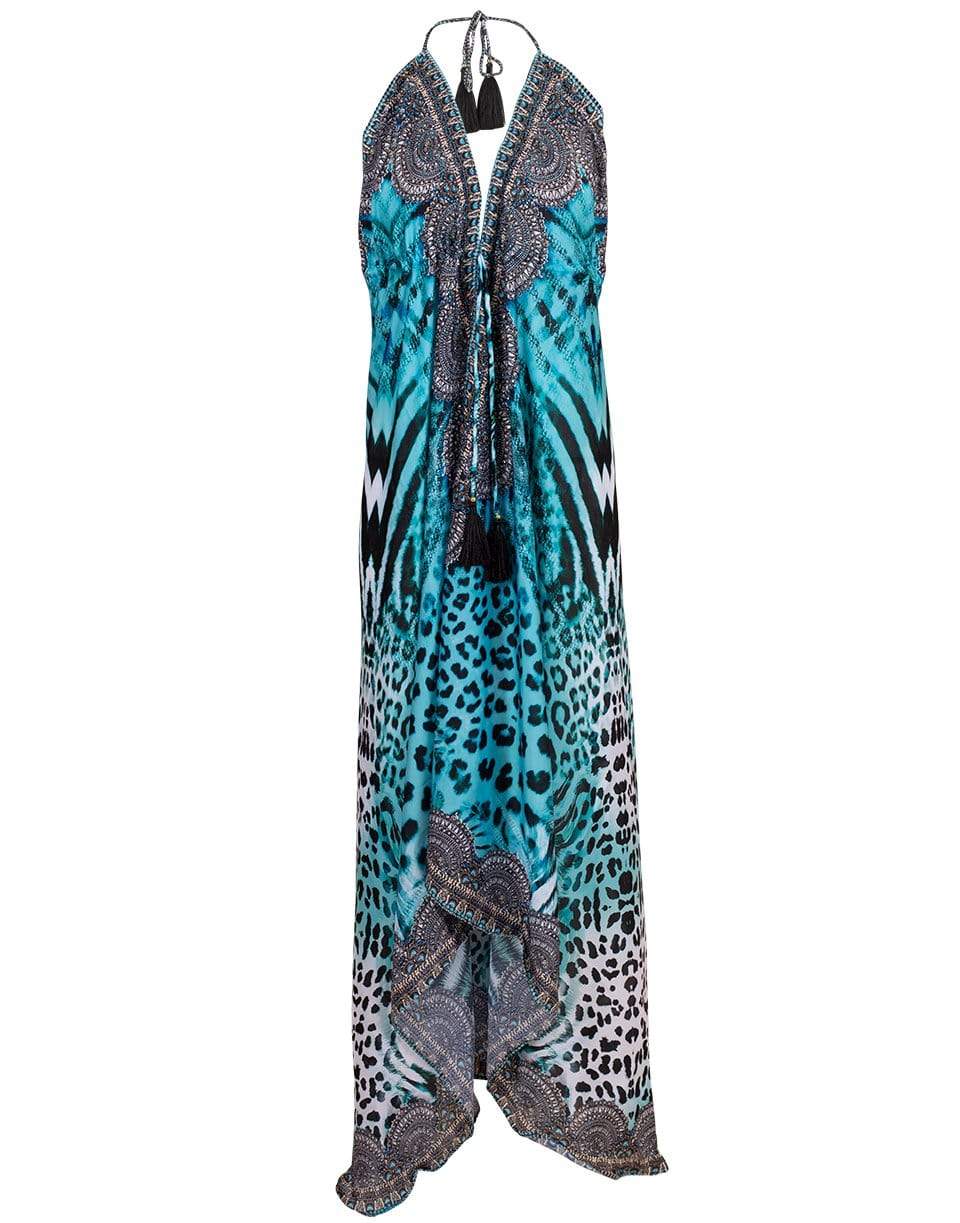 Ranee's blue Hawaii print V-neck long halter dress with a relaxed fit, asymmetrical hem, open back, tassel neck ties, and maxi length.