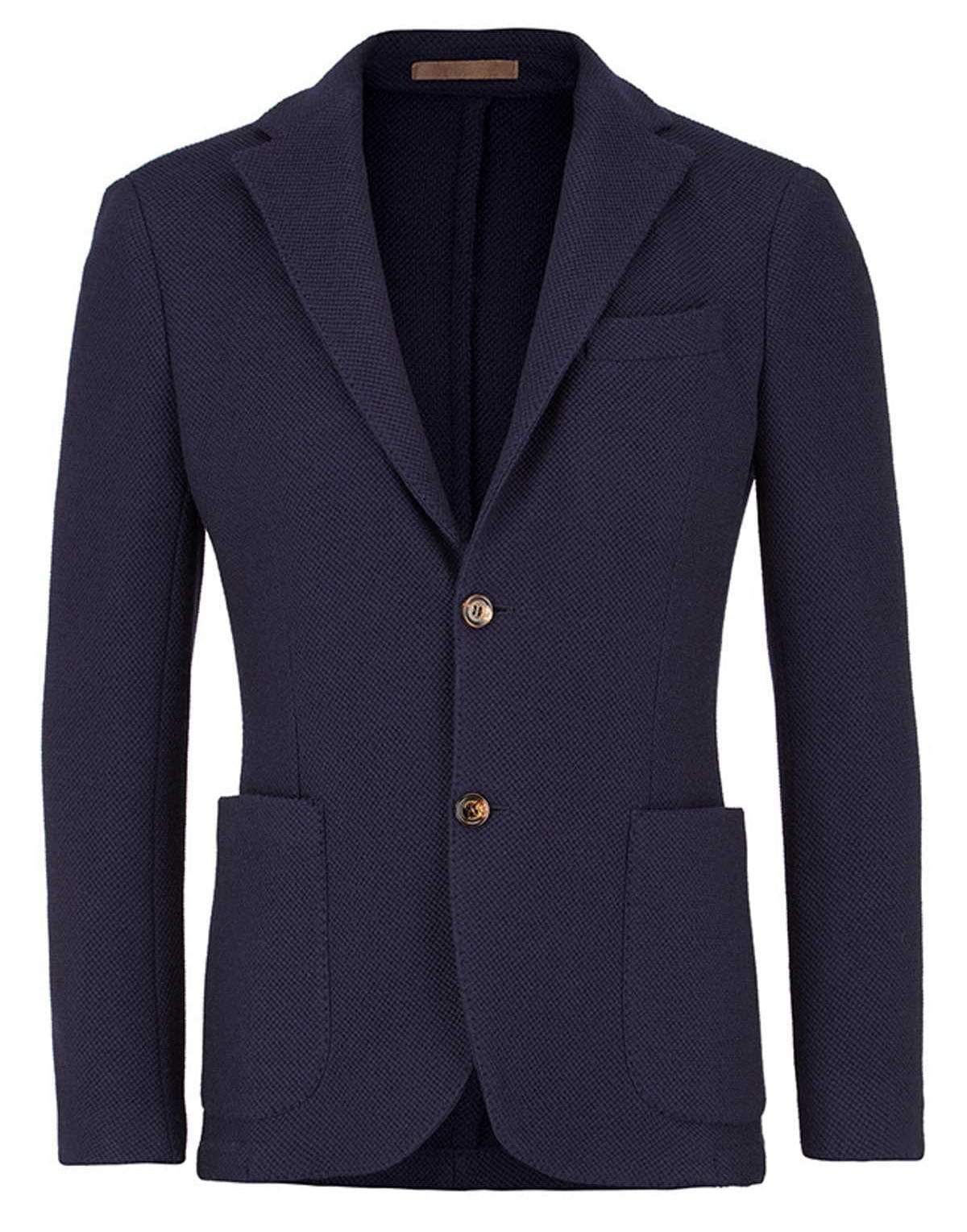 Eleventy laser cut jacket with a spread collar with lapel, two metal button closure, three front pockets. Laser cut jacket with button cuff detail, two back vents, raw edge detail, and classic silhouette.