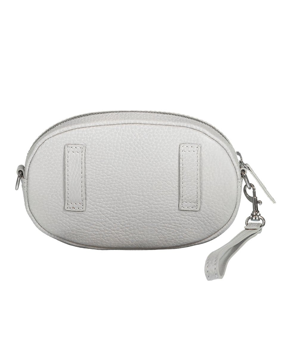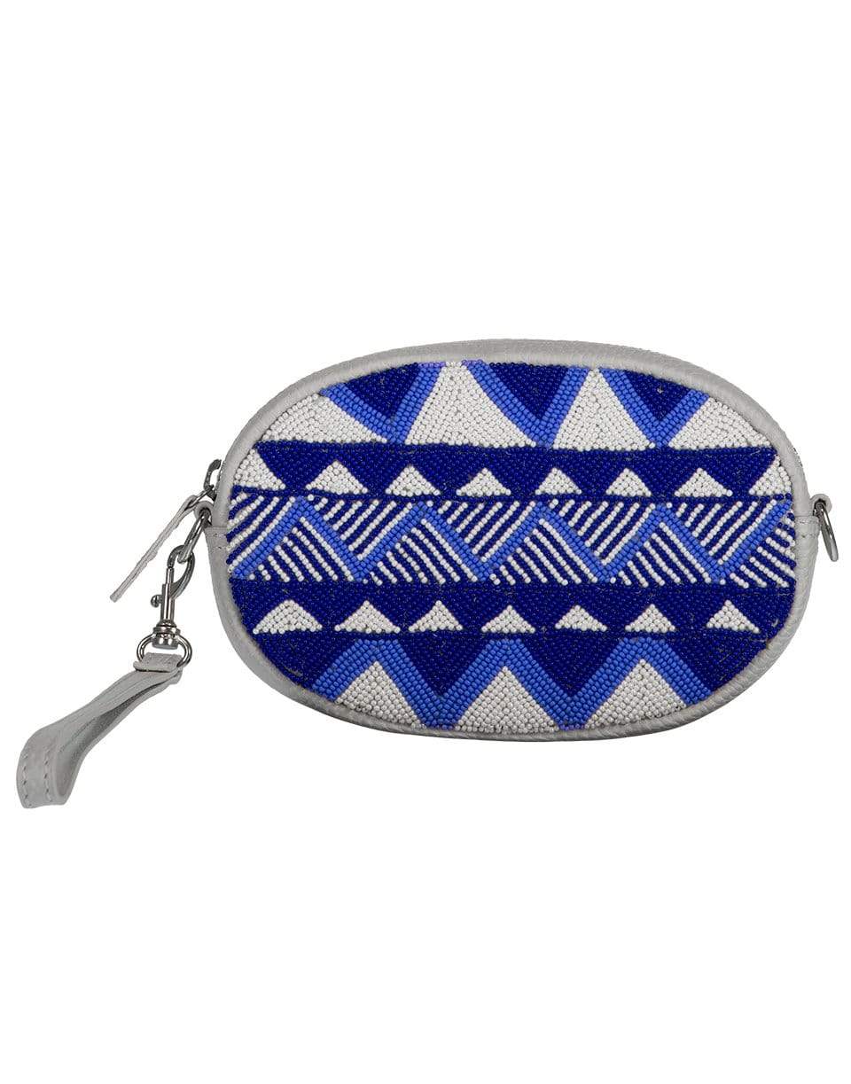 Aspiga Mariana zig zag belt bag with an oval silhouette, zip closure at top, and a wrist leather strap.
