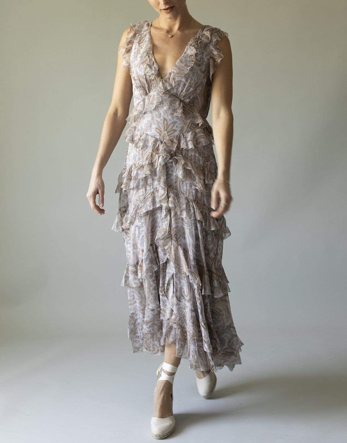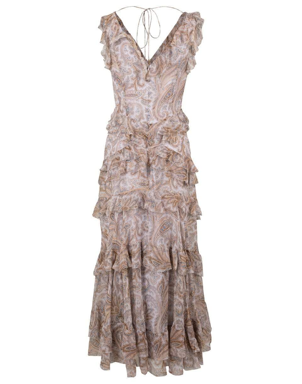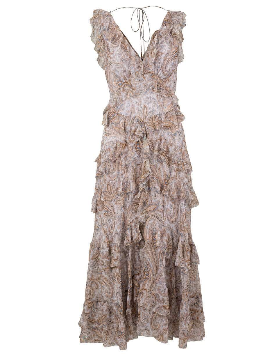 Zimmerman silk georgette midi dress with a V-neck and shaped ruffle tiers throughout.