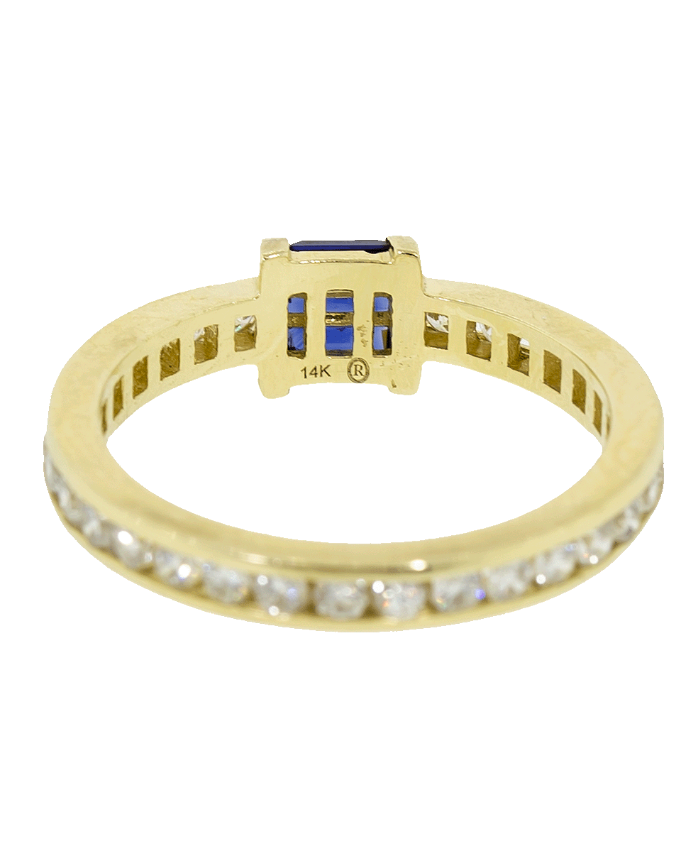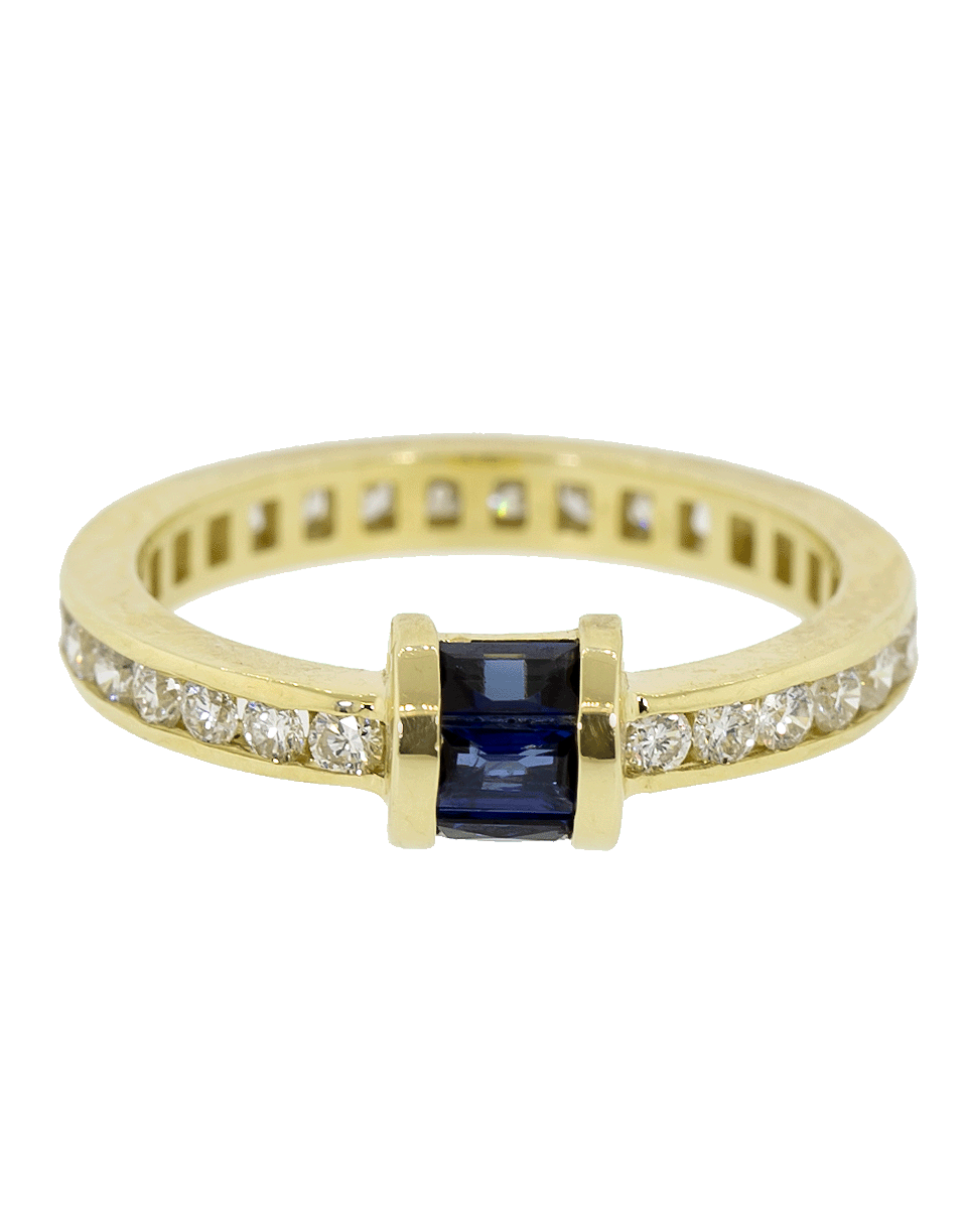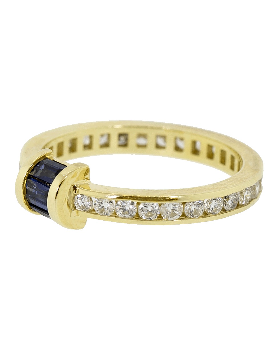 Channel barrel band with blue sapphires and diamonds set in 14k yellow gold.