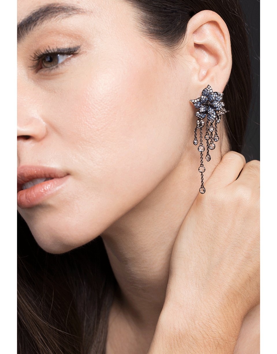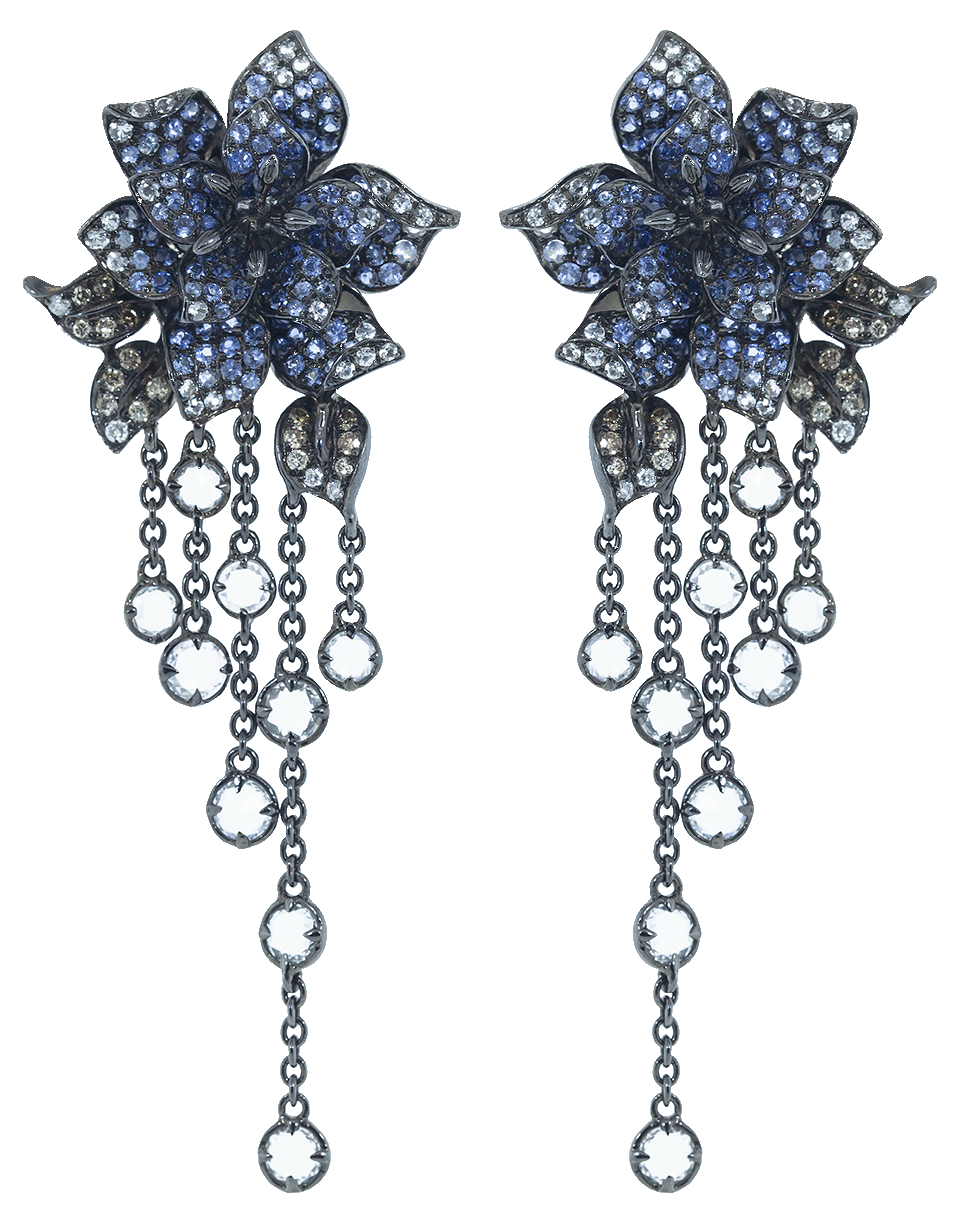 These cascading flower earrings from Wendy Yue are delicately crafted with blue and white sapphires and diamonds. For pierced ears.