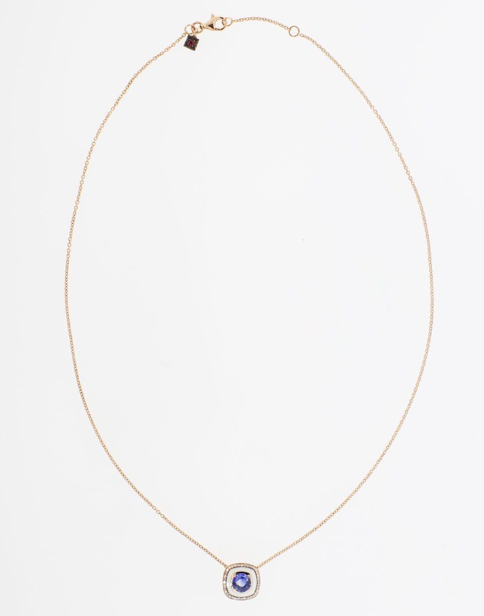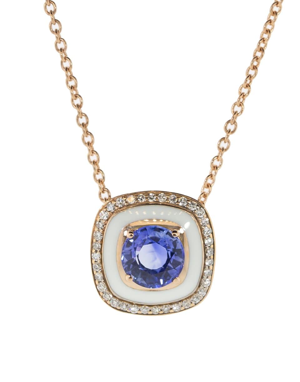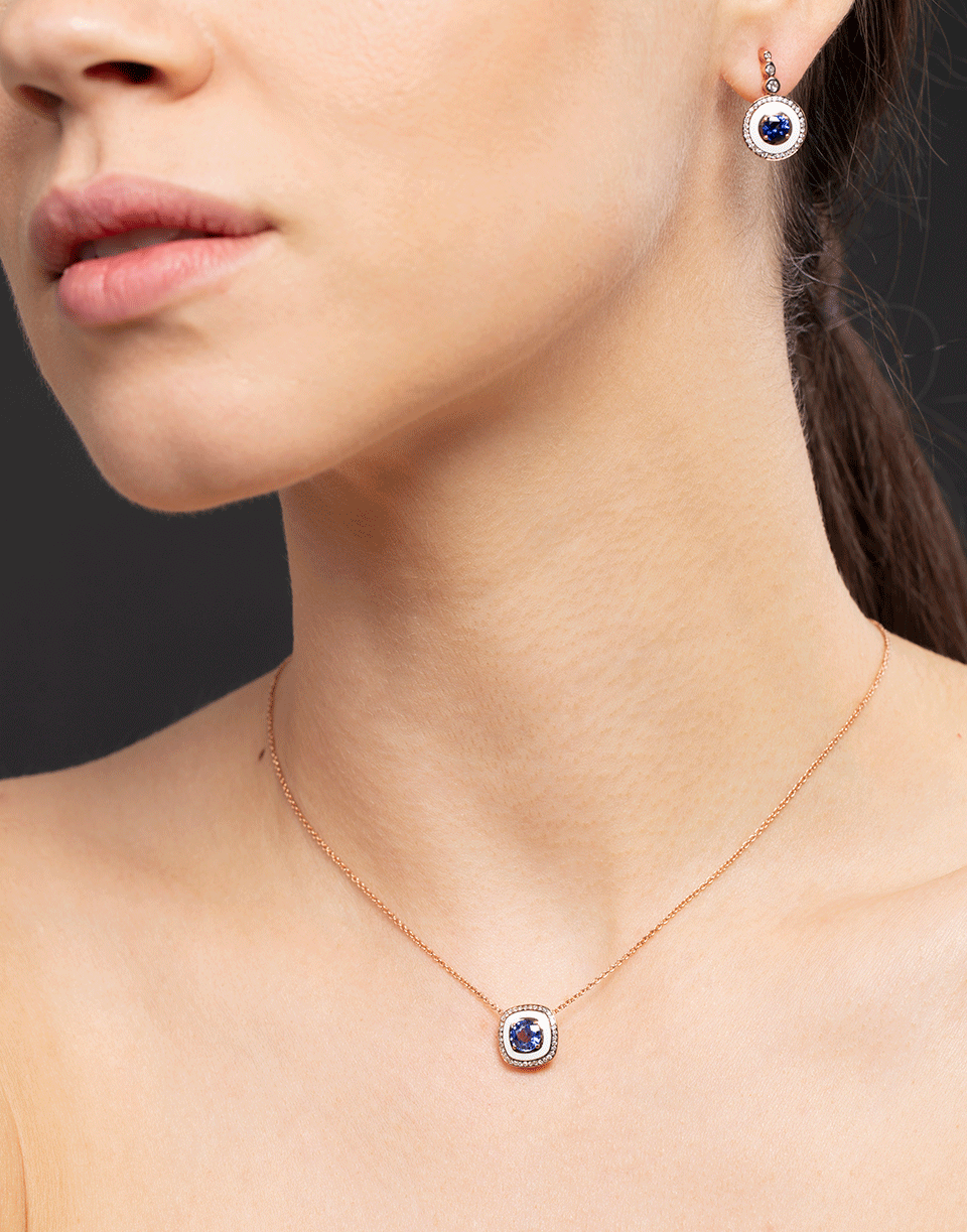 Blue sapphire and diamond pendant necklace with white enamel set in 18k rose gold from Selim Mouzannar.