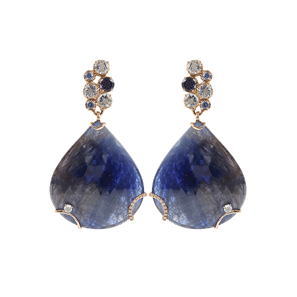 Brilliant Cut White Diamonds (0.06 CTW), Rose Cut White Diamonds (0.15 CTW), Blue Sapphire Drops (99.80 CTW), Sapphire Post (0.51 CTW), Aquamarine (2.70 CTW), Iolite (0.81 CTW)